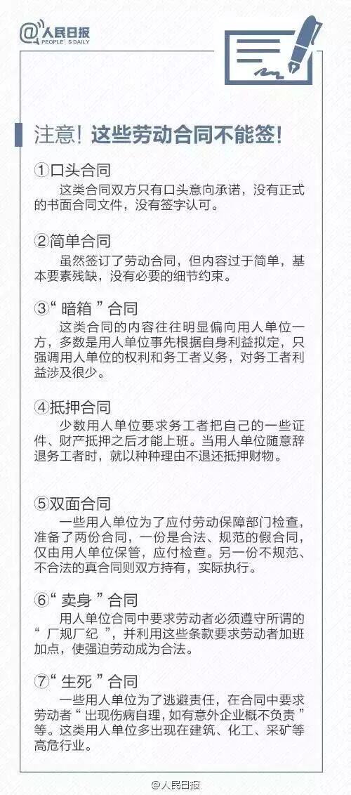 求职找工作,不少人拿到劳动合同的那刻,可能连合同内容都没看清,就挥着笔杆子“签签签”。别急!劳动合同包含哪些条款你清楚吗?试用期工资标准有哪些规定?……戳图了解,关于劳动合同,你必须知道这6件事。