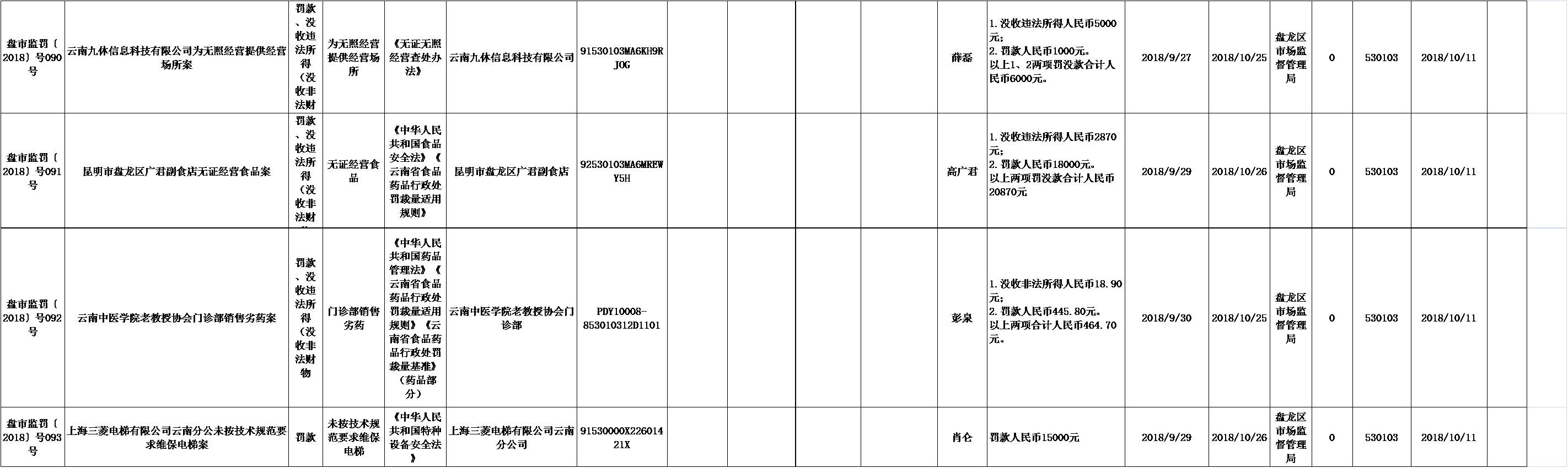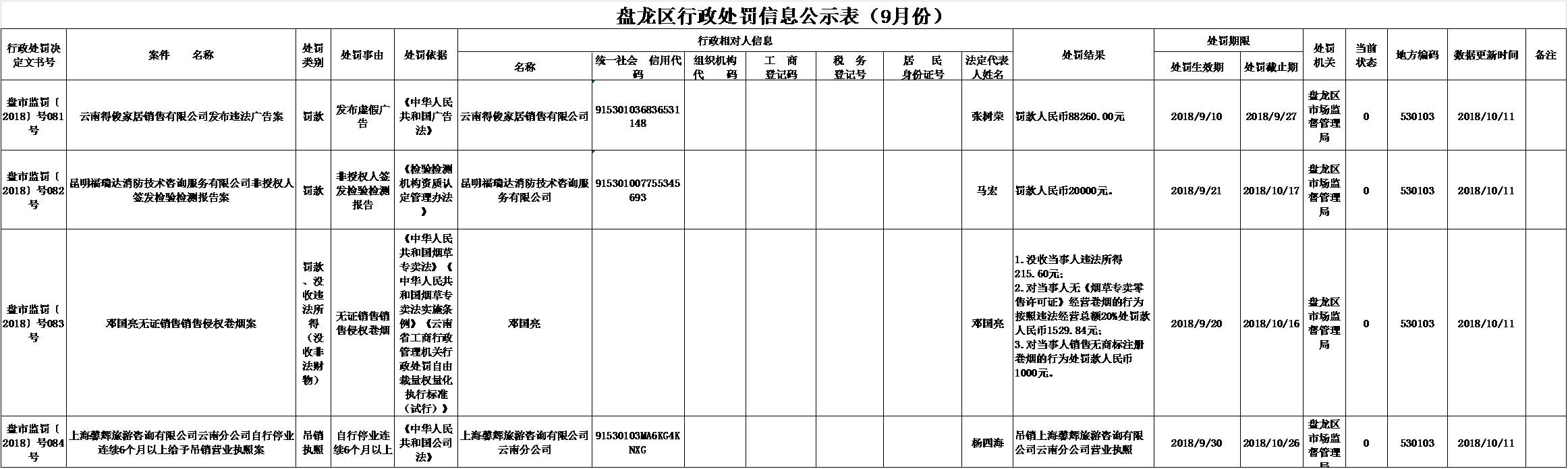 盘龙区2018年9月行政处罚信息公示表