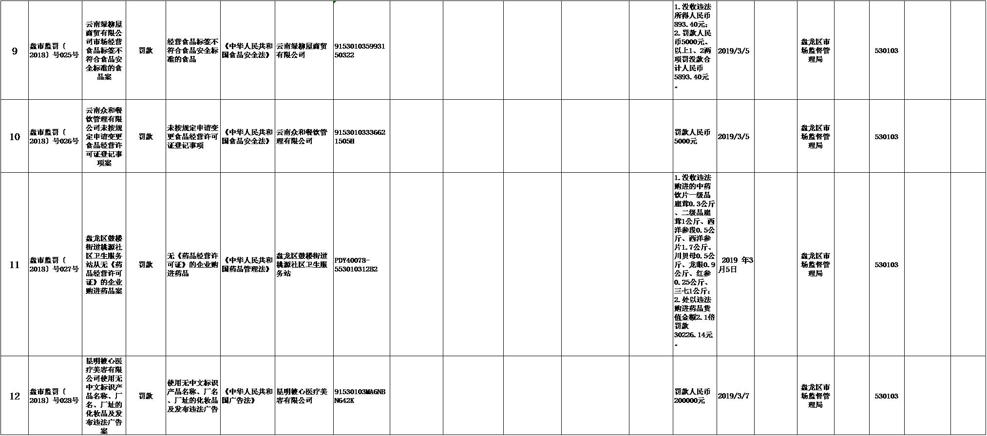 2019年3月盘龙区行政处罚信息公示表