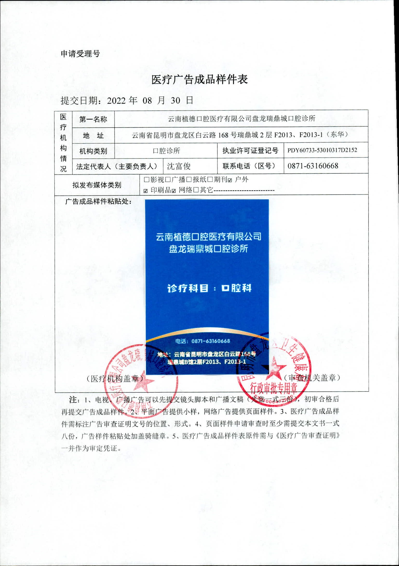 昆明市盘龙区卫生健康局云南植德口腔医疗有限公司盘龙瑞鼎城口腔诊所《医疗广告审查证明》