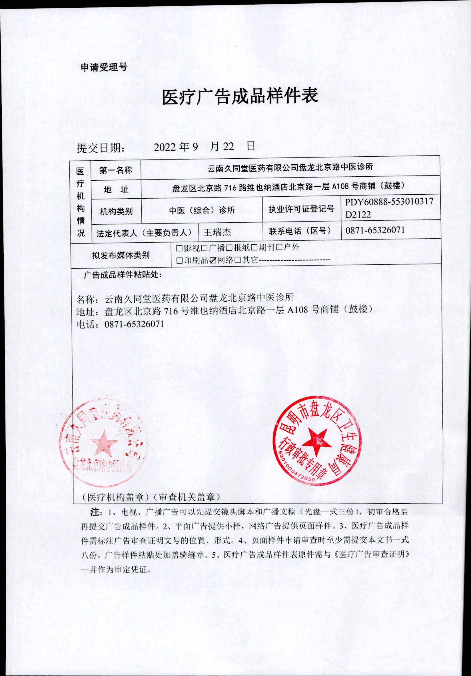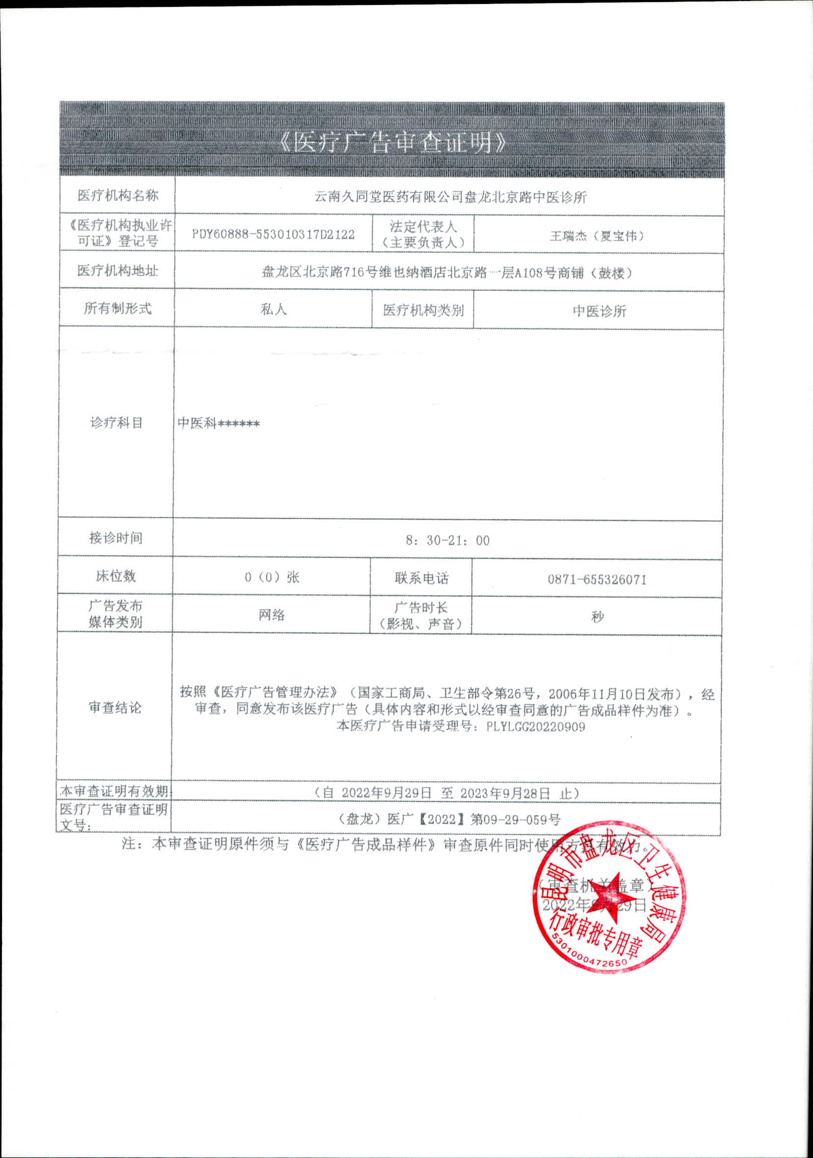 昆明市盘龙区卫生健康局云南久同堂医药有限公司盘龙北京路中医诊所《医疗广告审查证明》