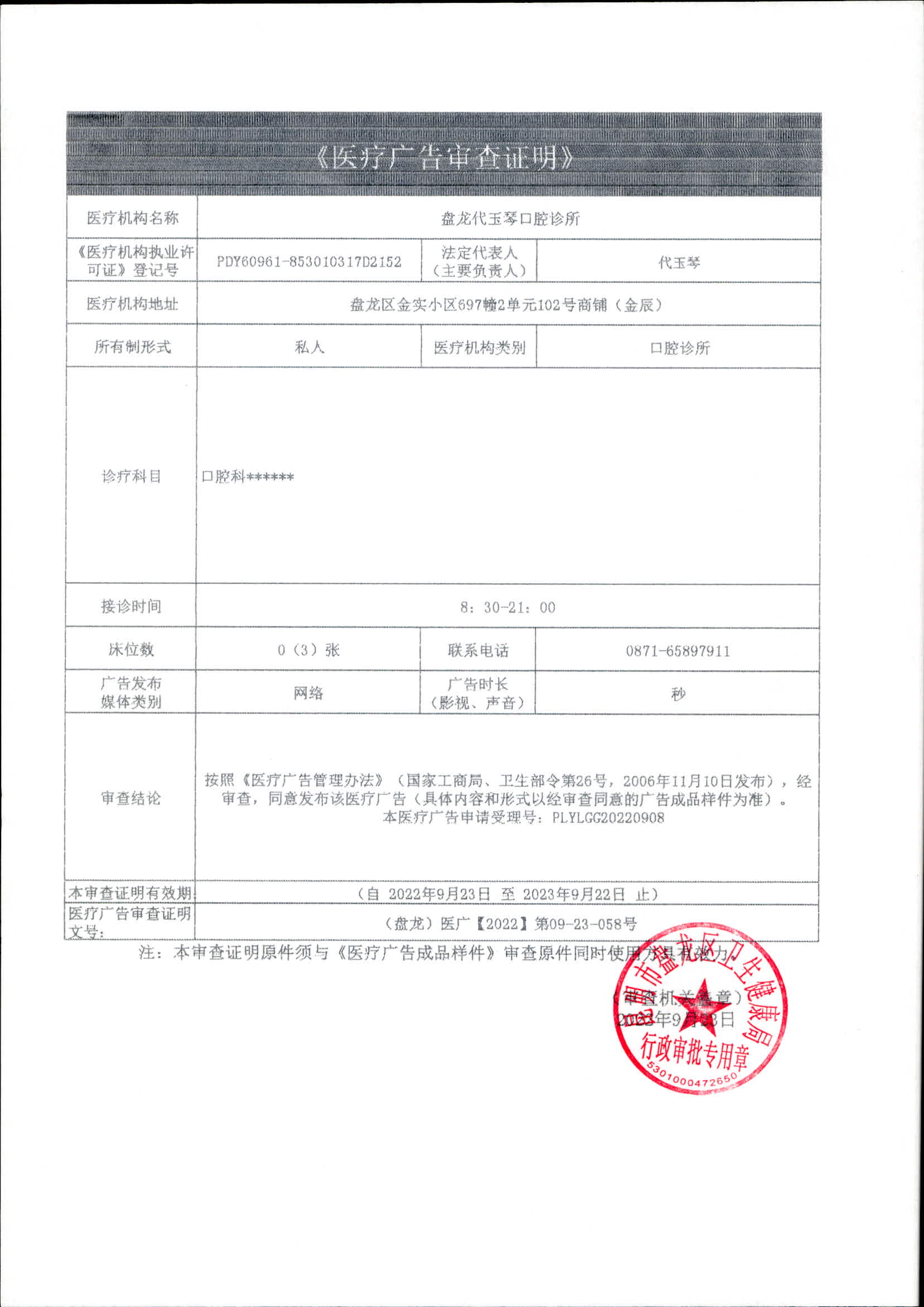 昆明市盘龙区卫生健康局盘龙代玉琴口腔诊所《医疗广告审查证明》