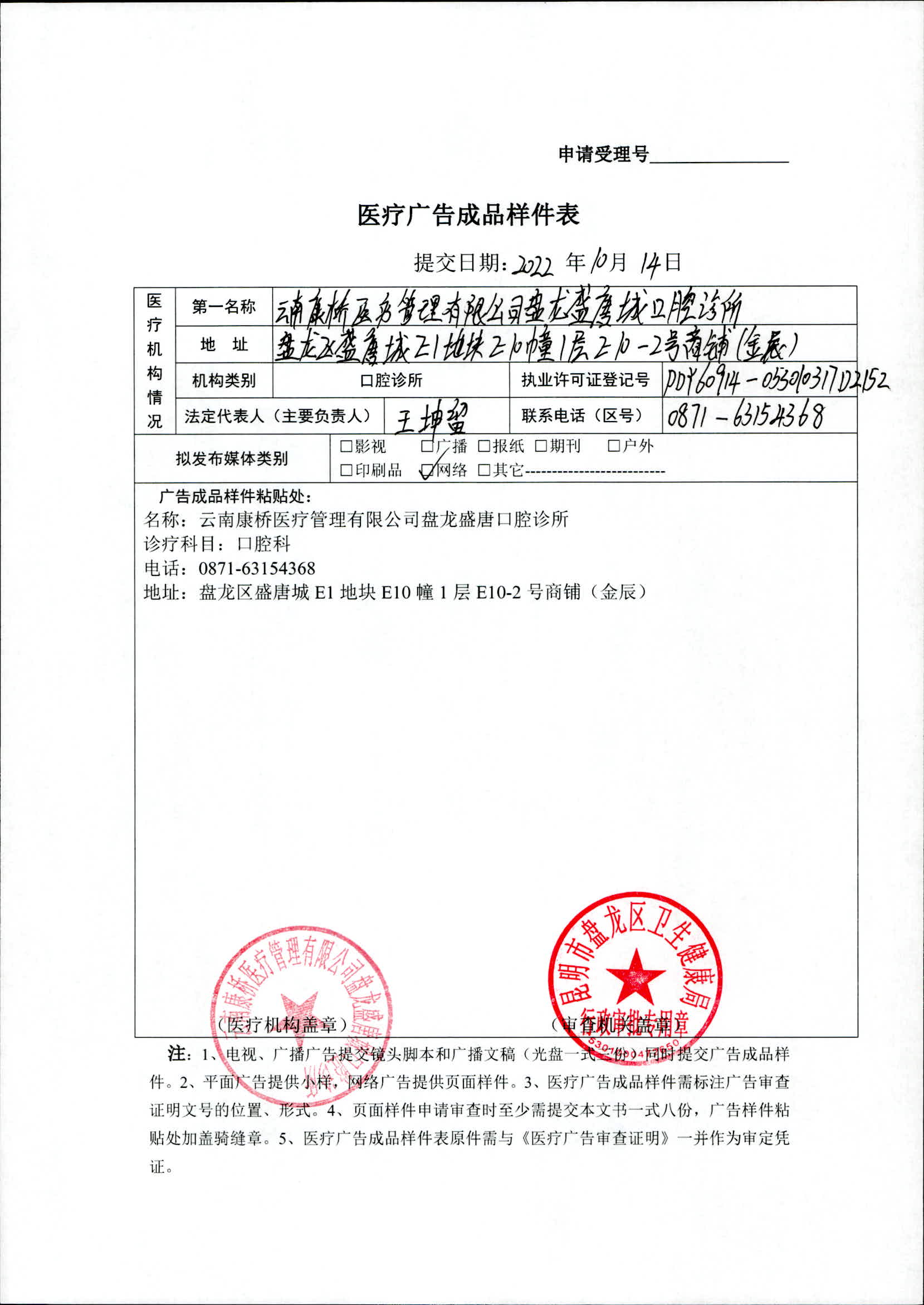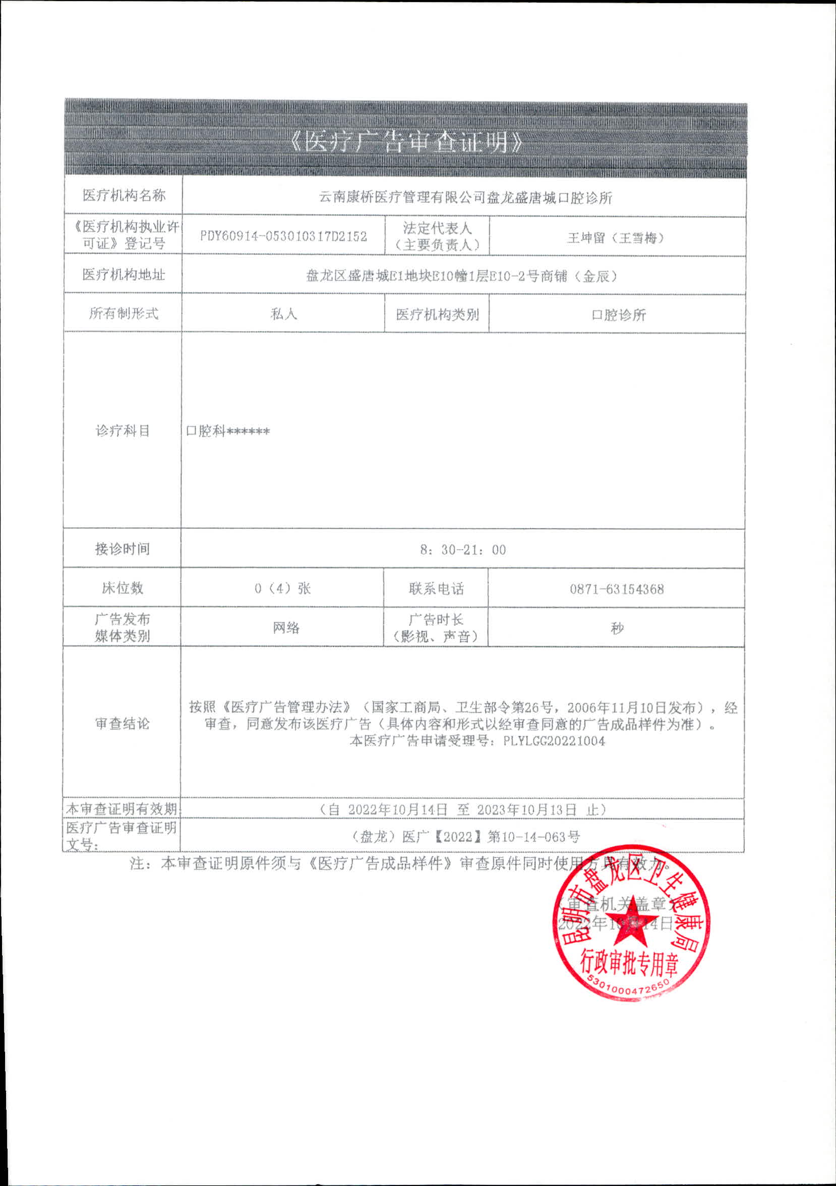 昆明市盘龙区卫生健康局云南康桥医疗管理有限公司盘龙盛唐城口腔诊所 医疗广告审查证明