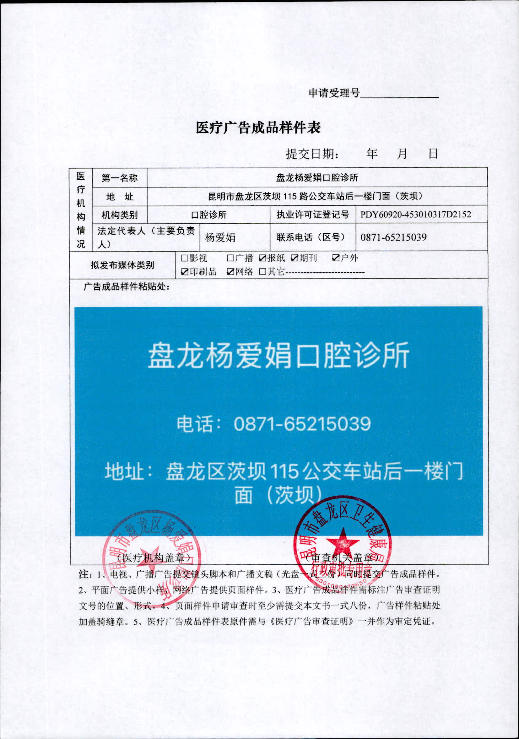 昆明市盘龙区卫生健康局盘龙杨爱娟口腔诊所 医疗广告审查证明