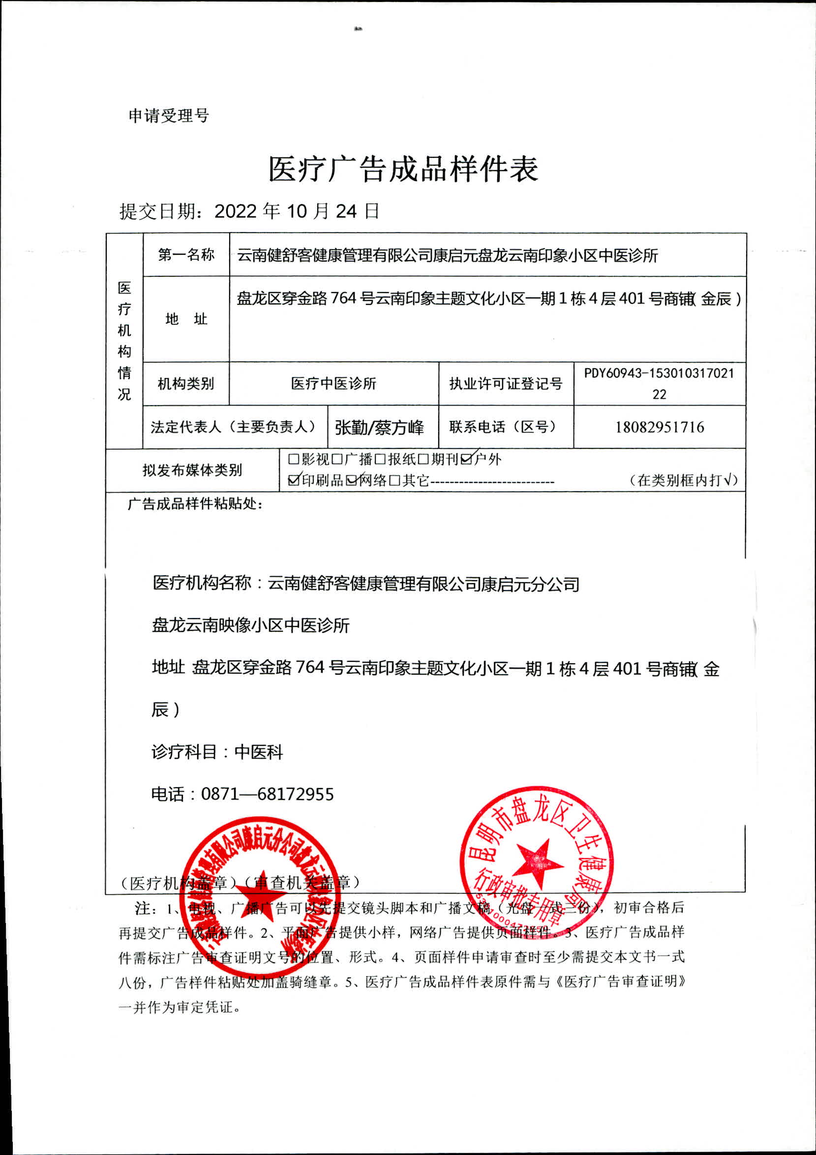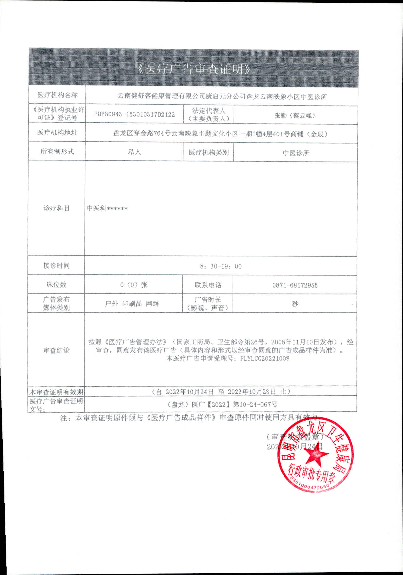 昆明市盘龙区卫生健康局云南健舒客健康管理有限公司康启元分公司盘龙云南映象小区中医诊所 医疗广告审查证明