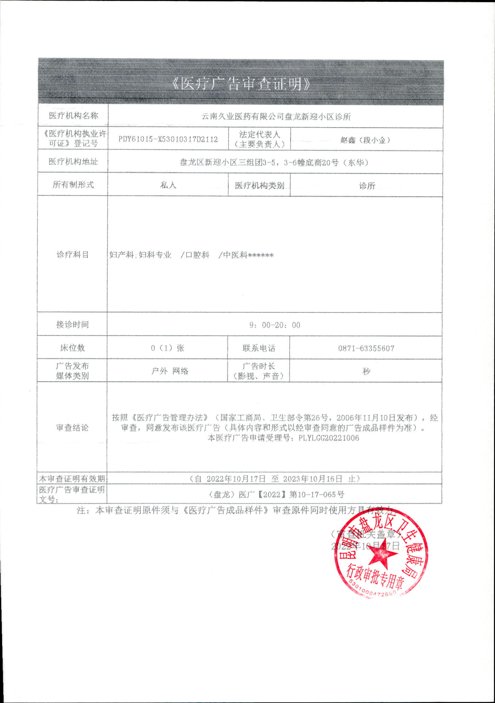 昆明市盘龙区卫生健康局云南久业医药有限公司盘龙新迎小区诊所 医疗广告审查证明