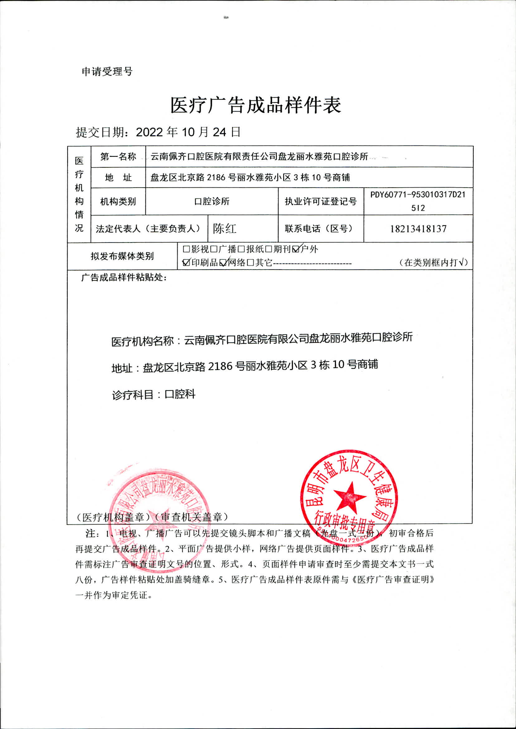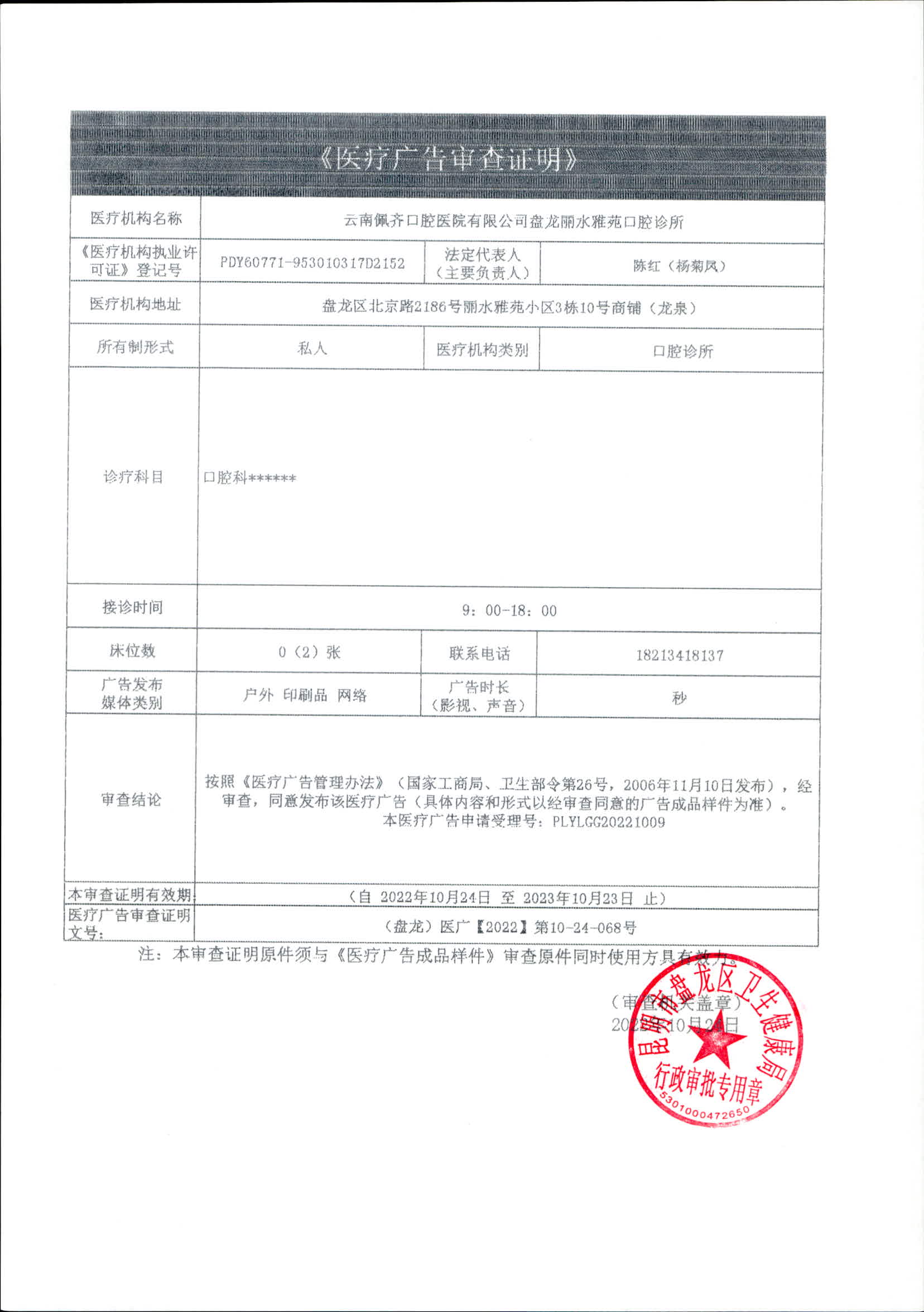 昆明市盘龙区卫生健康局云南佩齐口腔医院有限公司盘龙丽水雅苑口腔诊所 医疗广告审查证明
