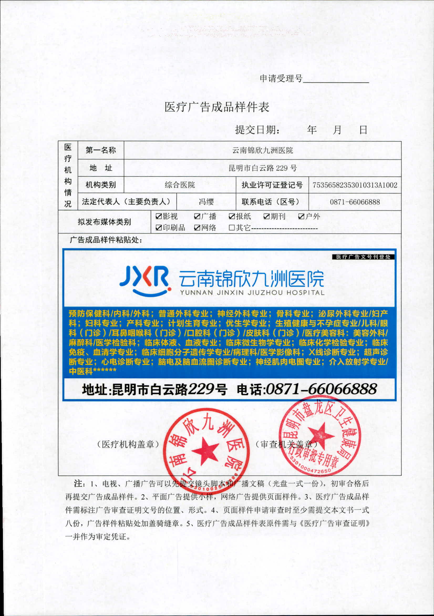 昆明市盘龙区卫生健康局云南锦欣九洲医院 《医疗广告审查证明》