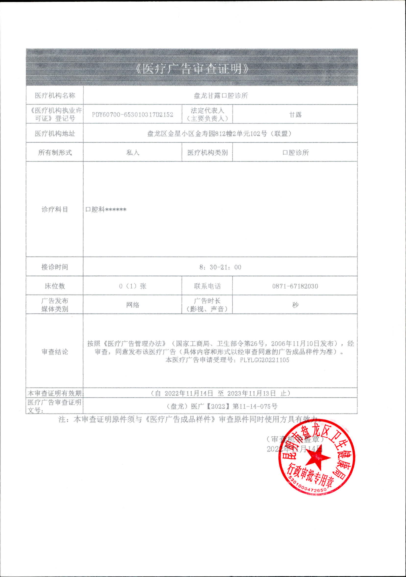 昆明市盘龙区卫生健康局盘龙甘露口腔诊所 医疗广告审查证明