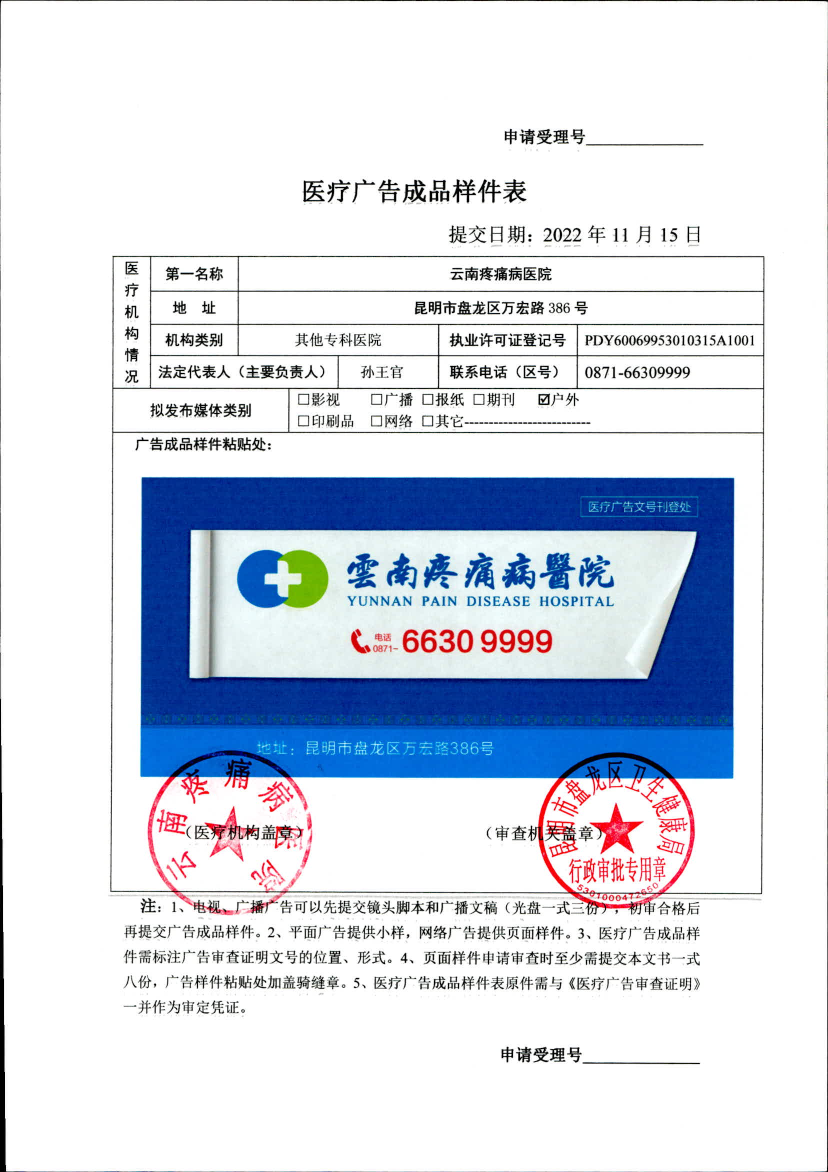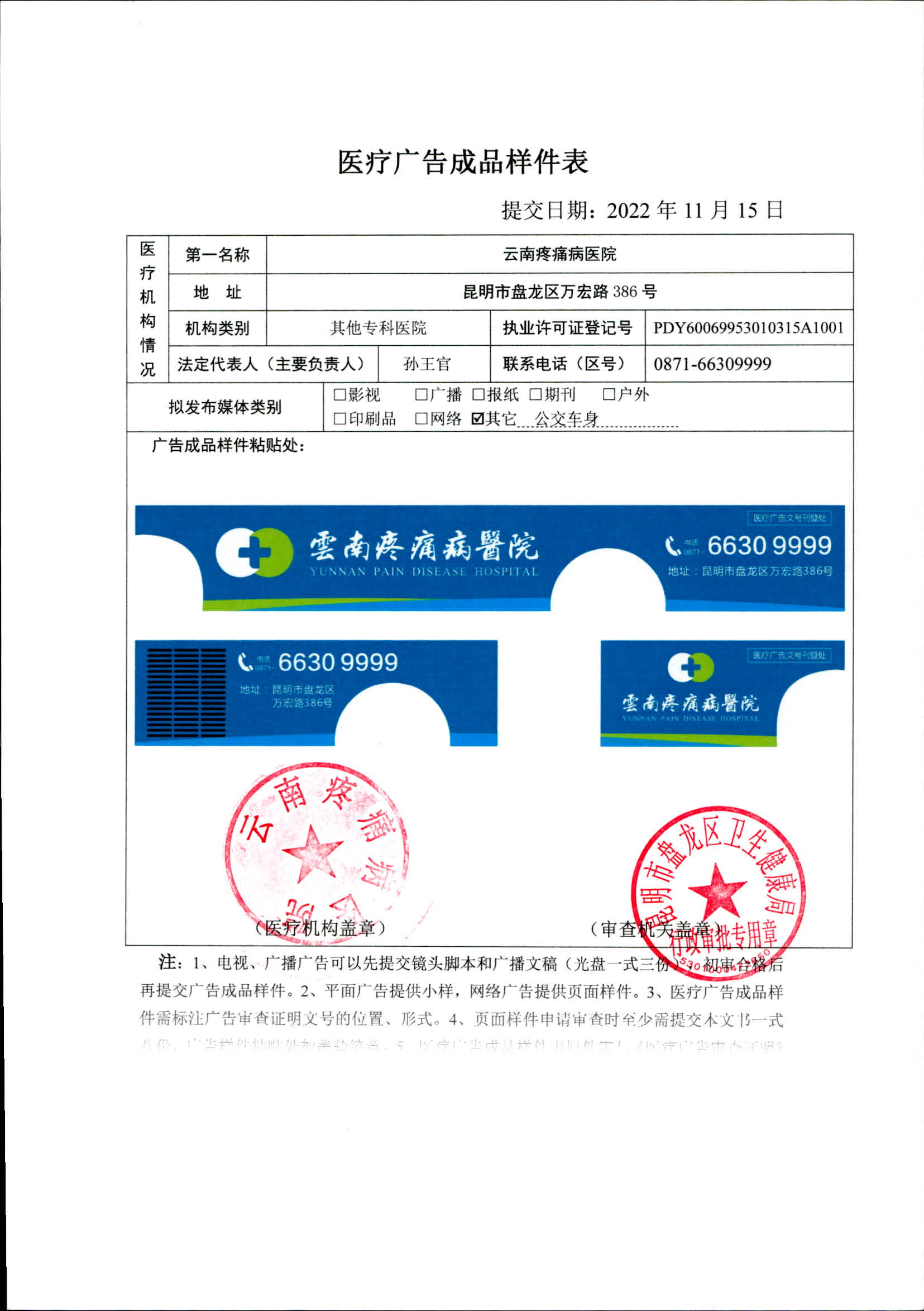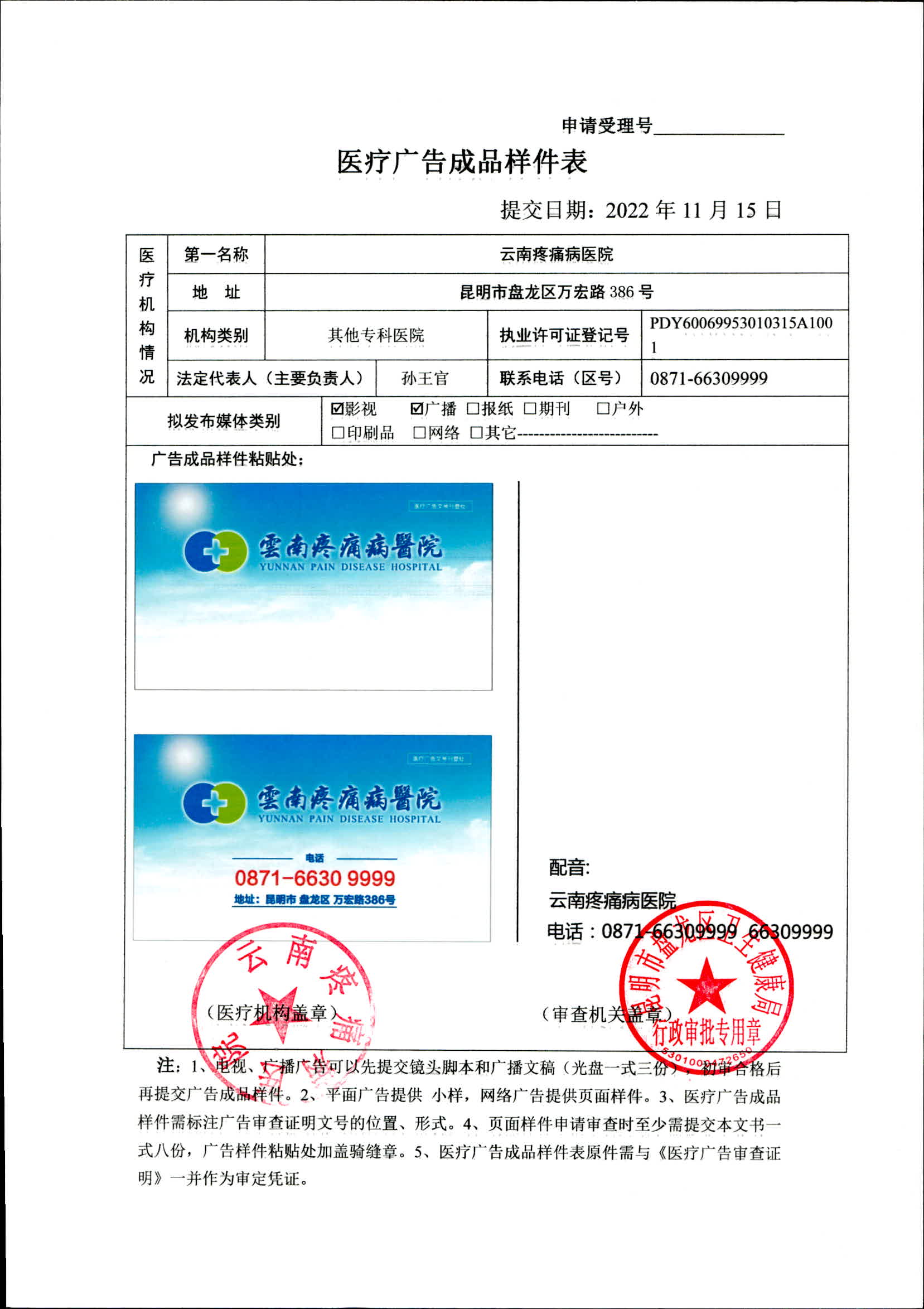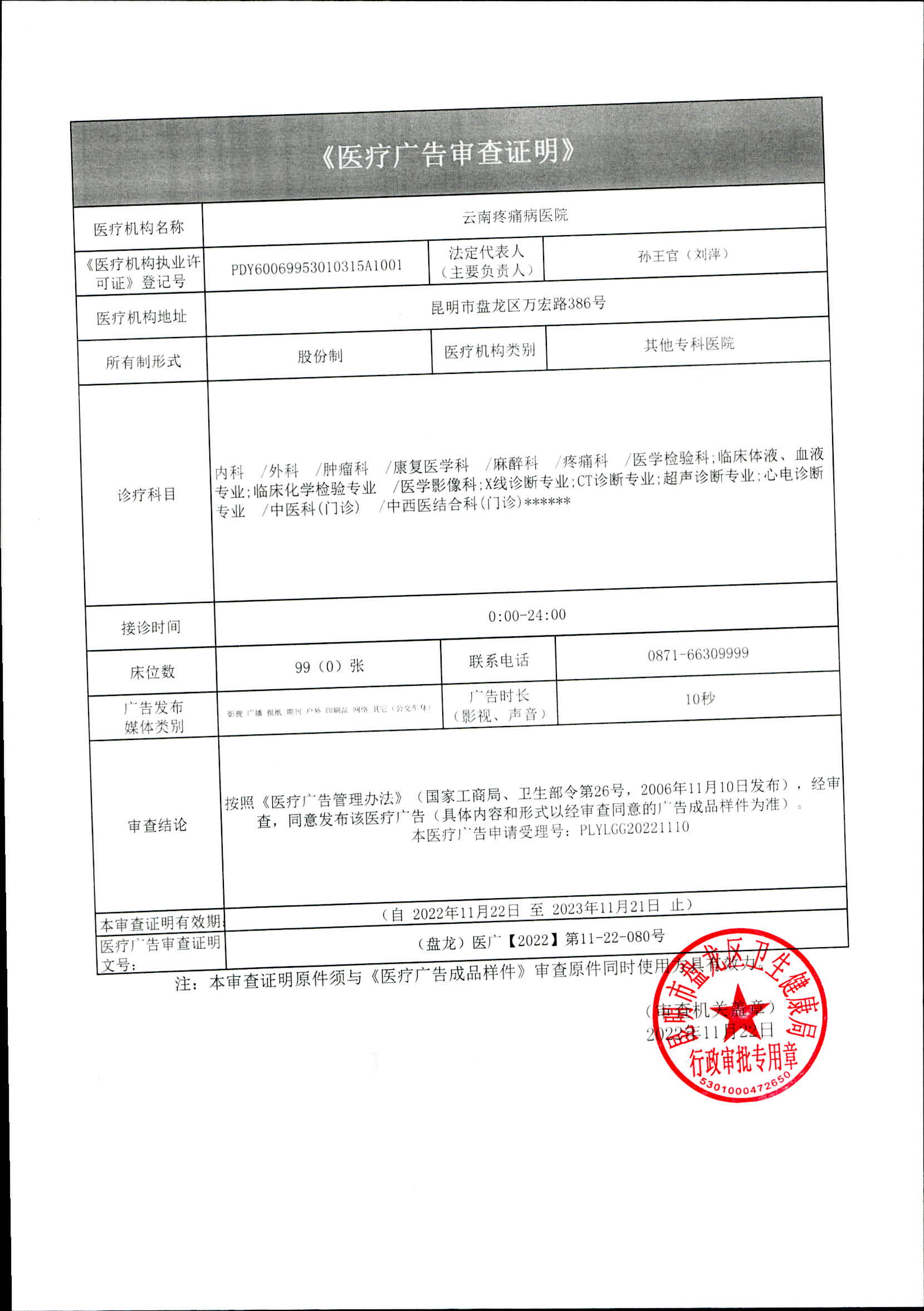 昆明市盘龙区卫生健康局云南疼痛病医院 2022年医疗广告审查证明