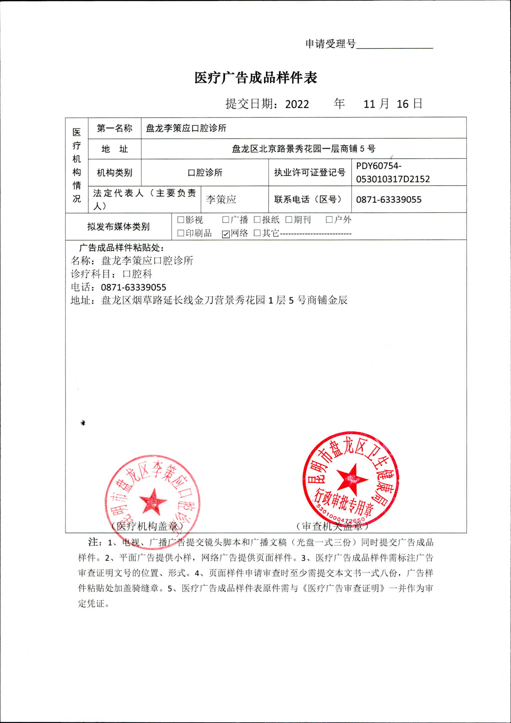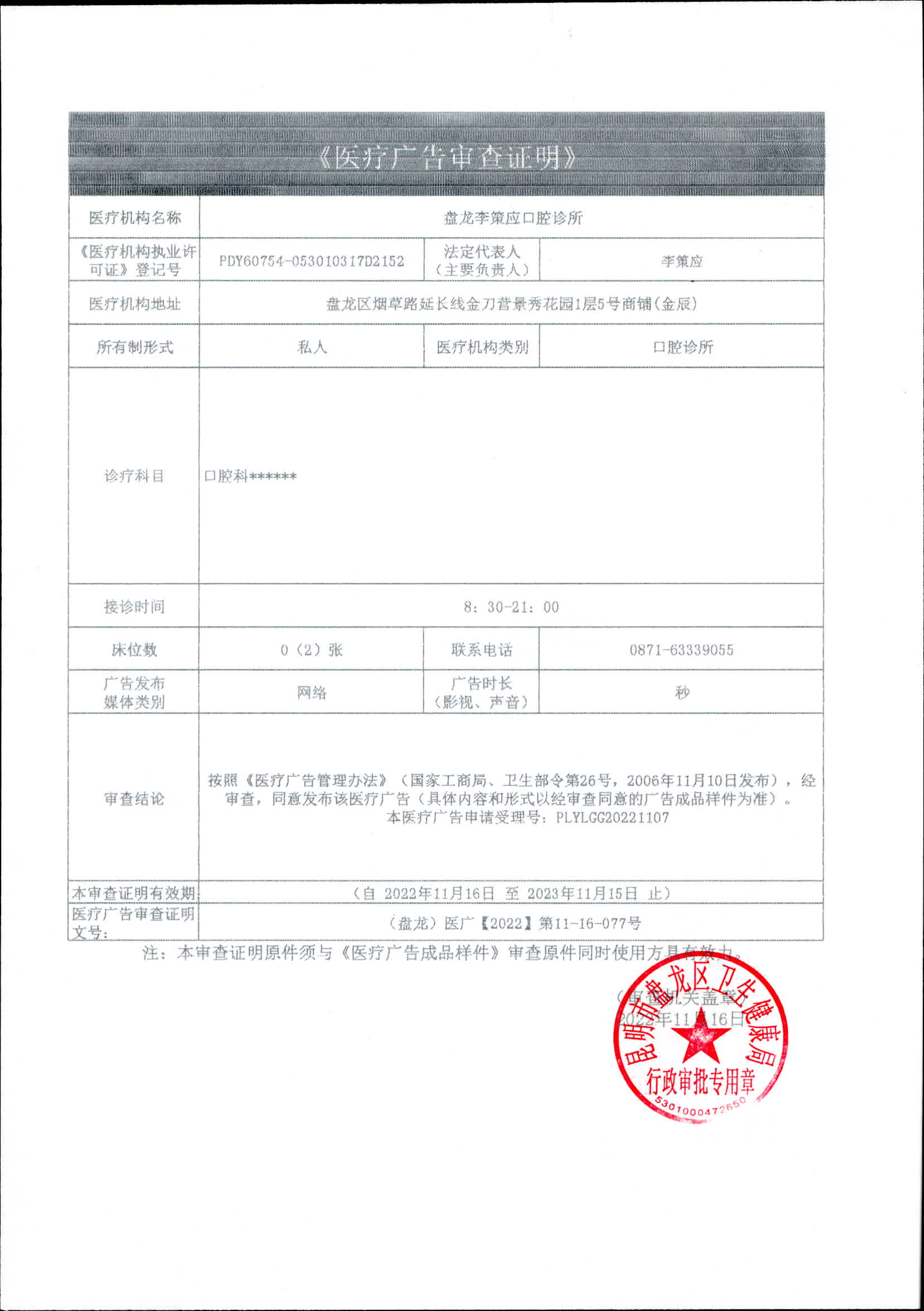 昆明市盘龙区卫生健康局盘龙李策应口腔诊所 医疗广告审查证明