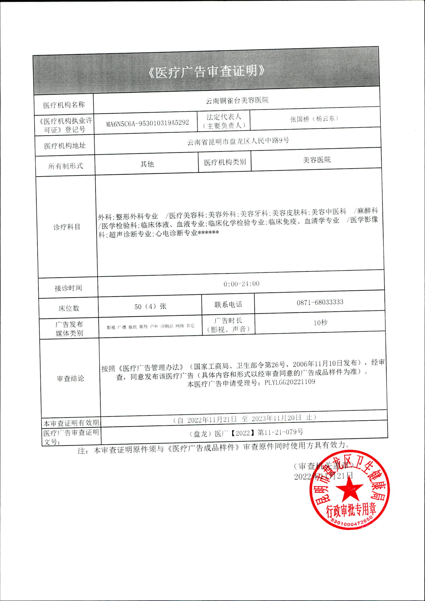 昆明市盘龙区卫生健康局云南铜雀台美容医院 2022年医疗广告审查证明