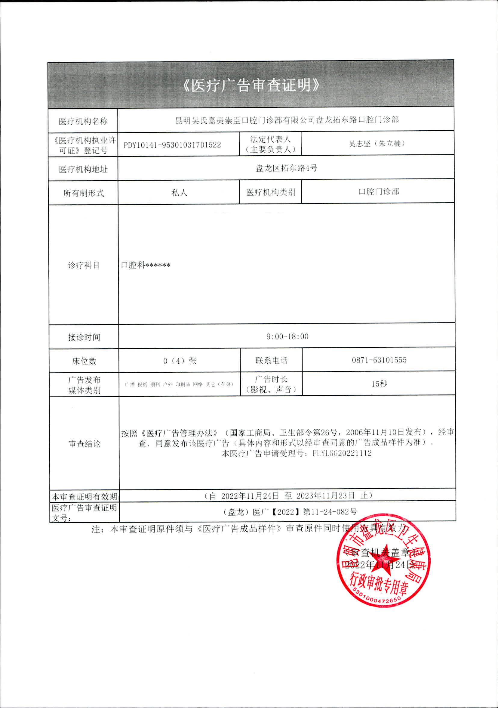 昆明市盘龙区卫生健康局昆明吴氏嘉美崇臣口腔门诊部有限公司盘龙拓东路口腔门诊部 医疗广告审查证明