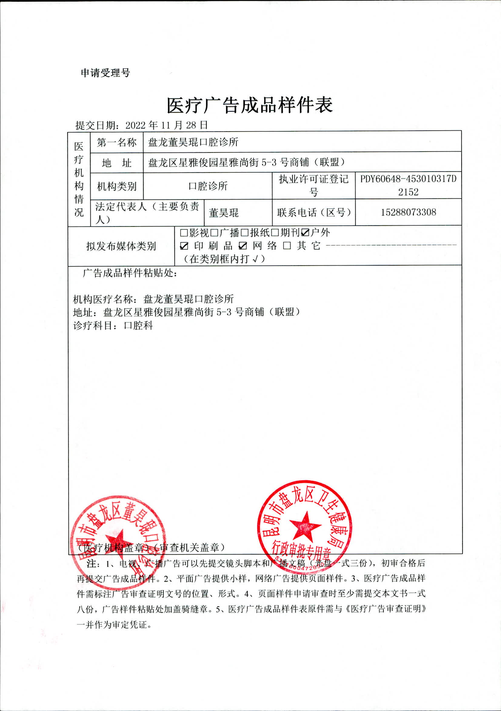 昆明市盘龙区卫生健康局盘龙董昊琨口腔诊所 医疗广告审查证明