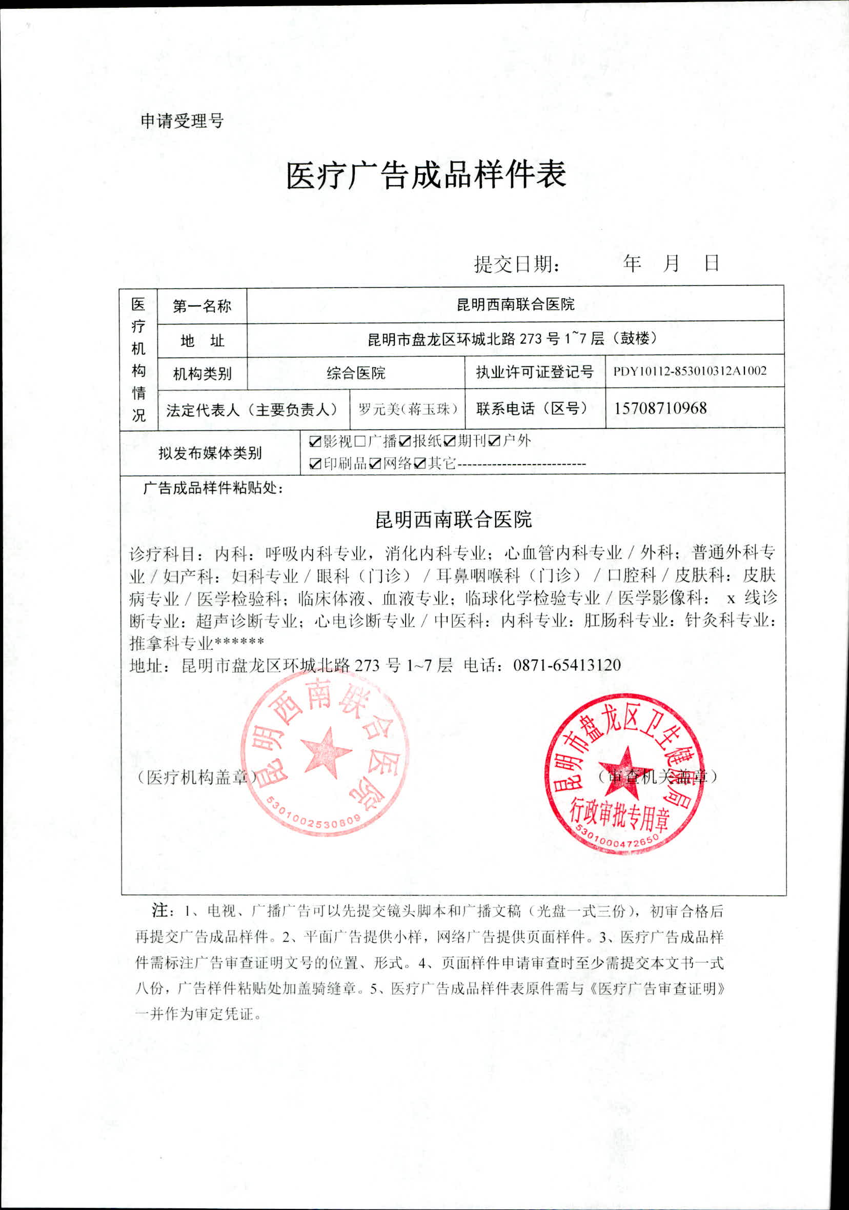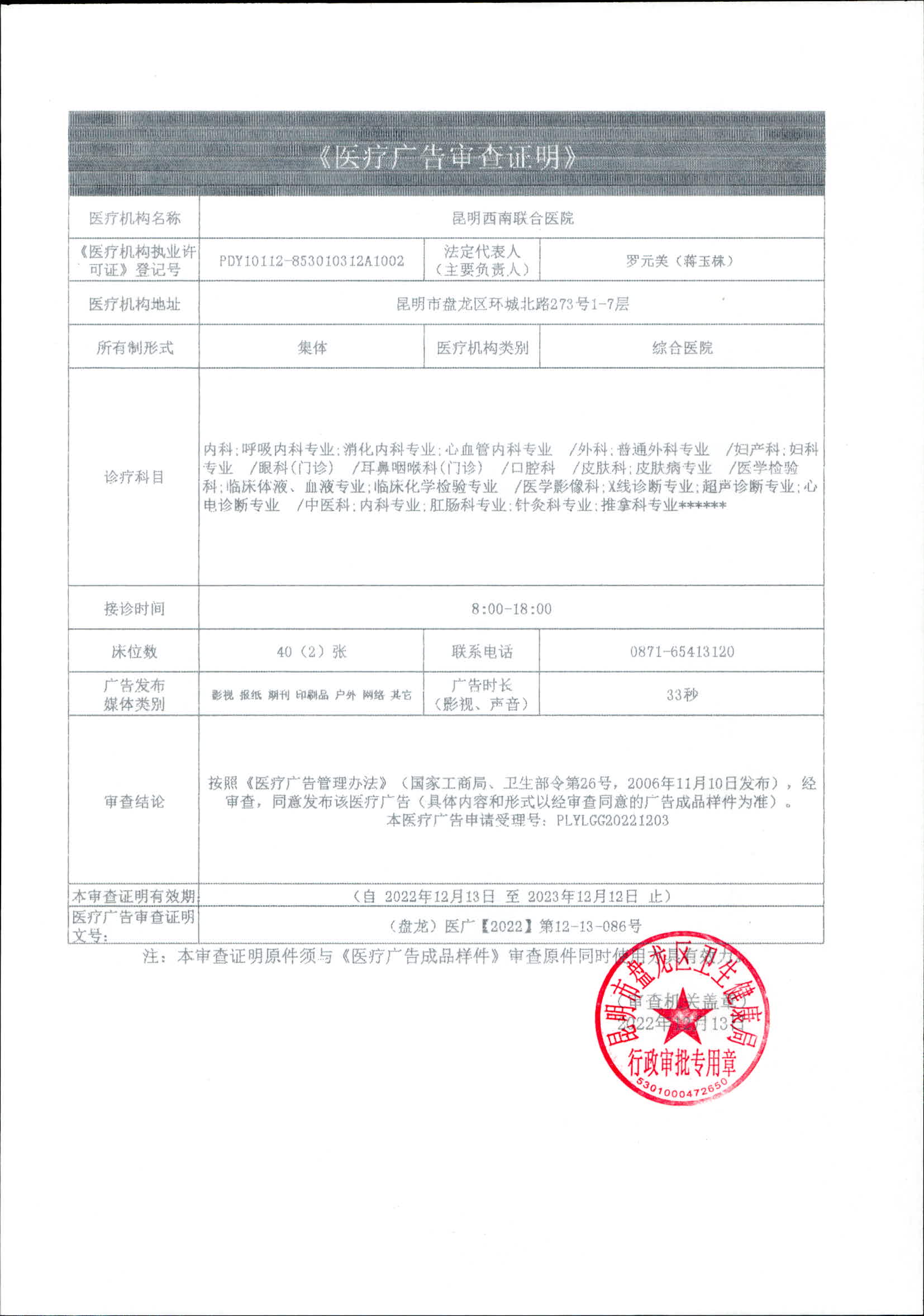 昆明市盘龙区卫生健康局昆明西南联合医院 2022年医疗广告审查证明