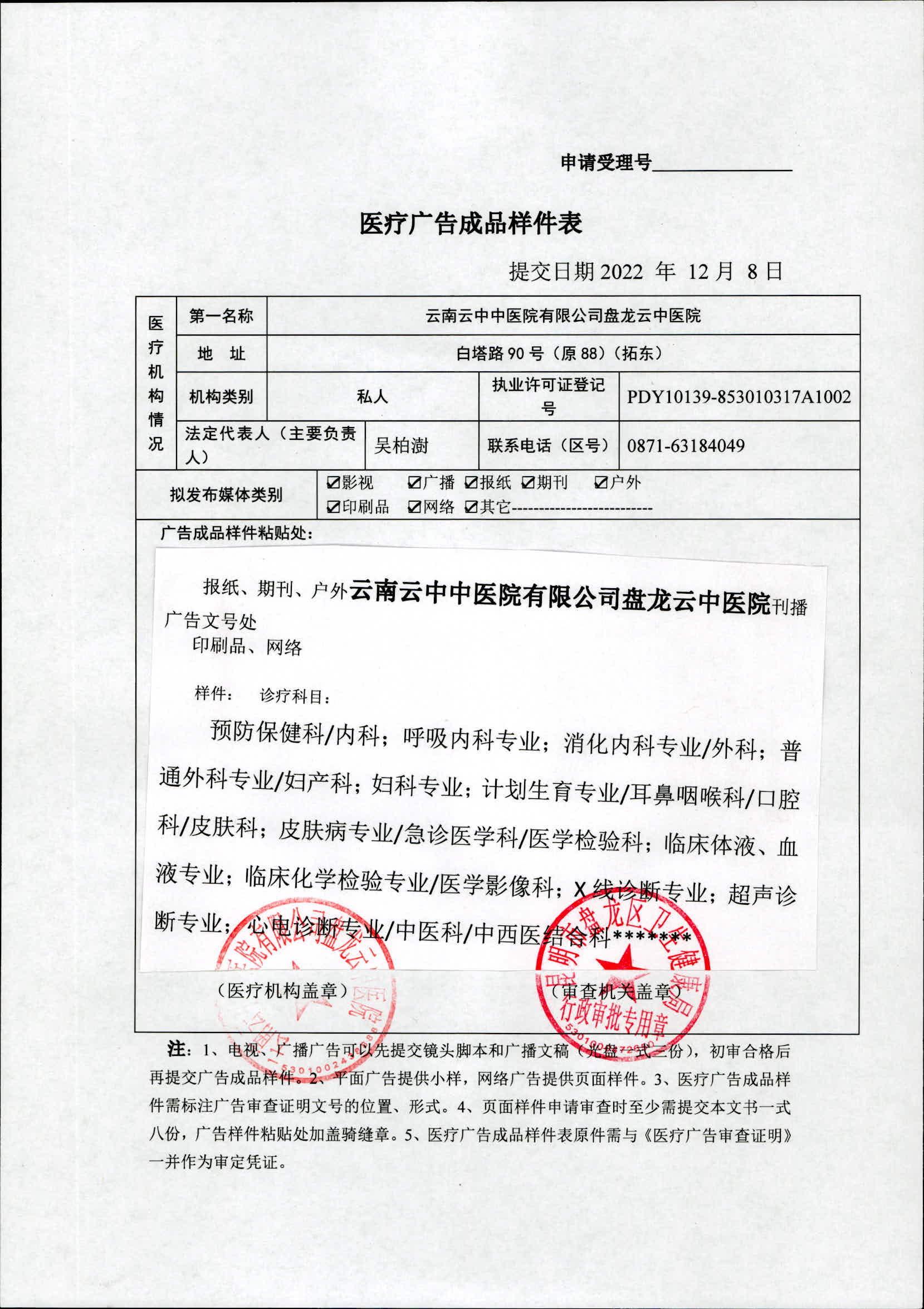 昆明市盘龙区卫生健康局云南云中中医院有限公司盘龙云中医院 2022年医疗广告审查证明