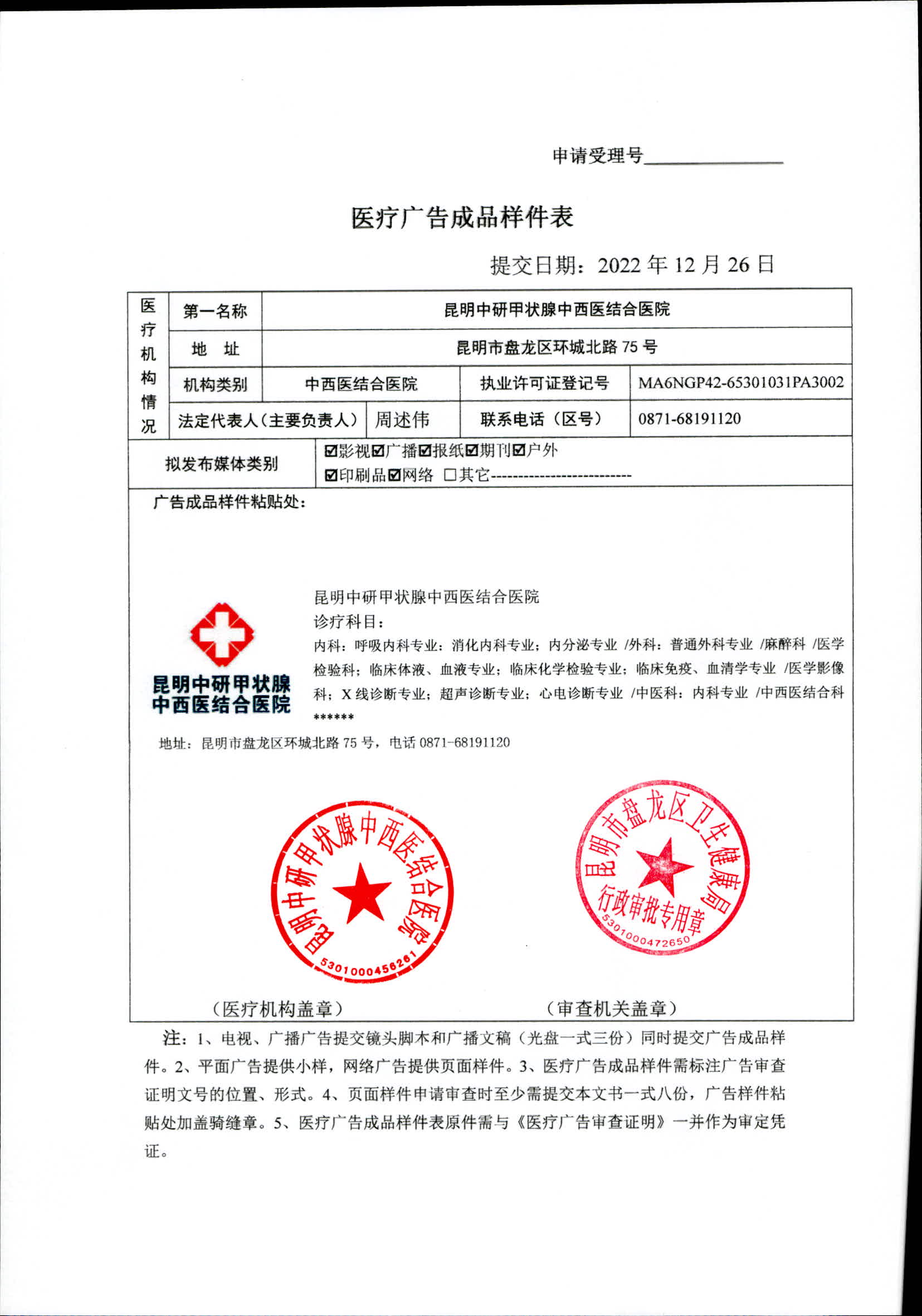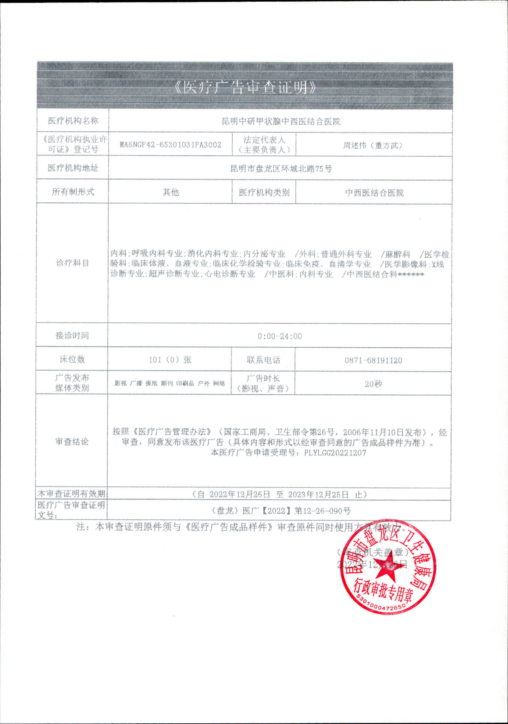 昆明市盘龙区卫生健康局昆明中研甲状腺中西医结合医院 2022年医疗广告审查证明
