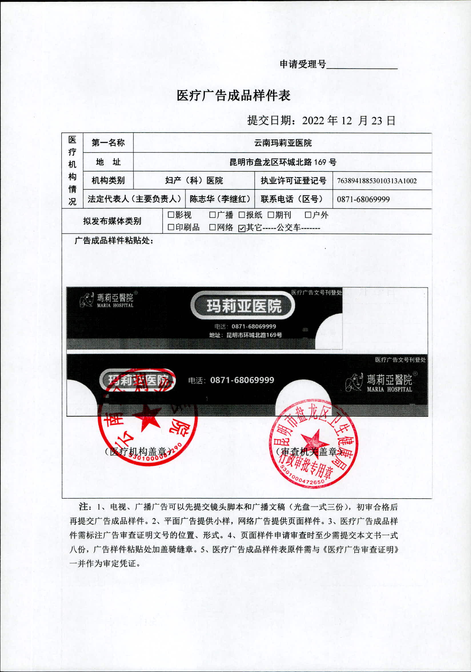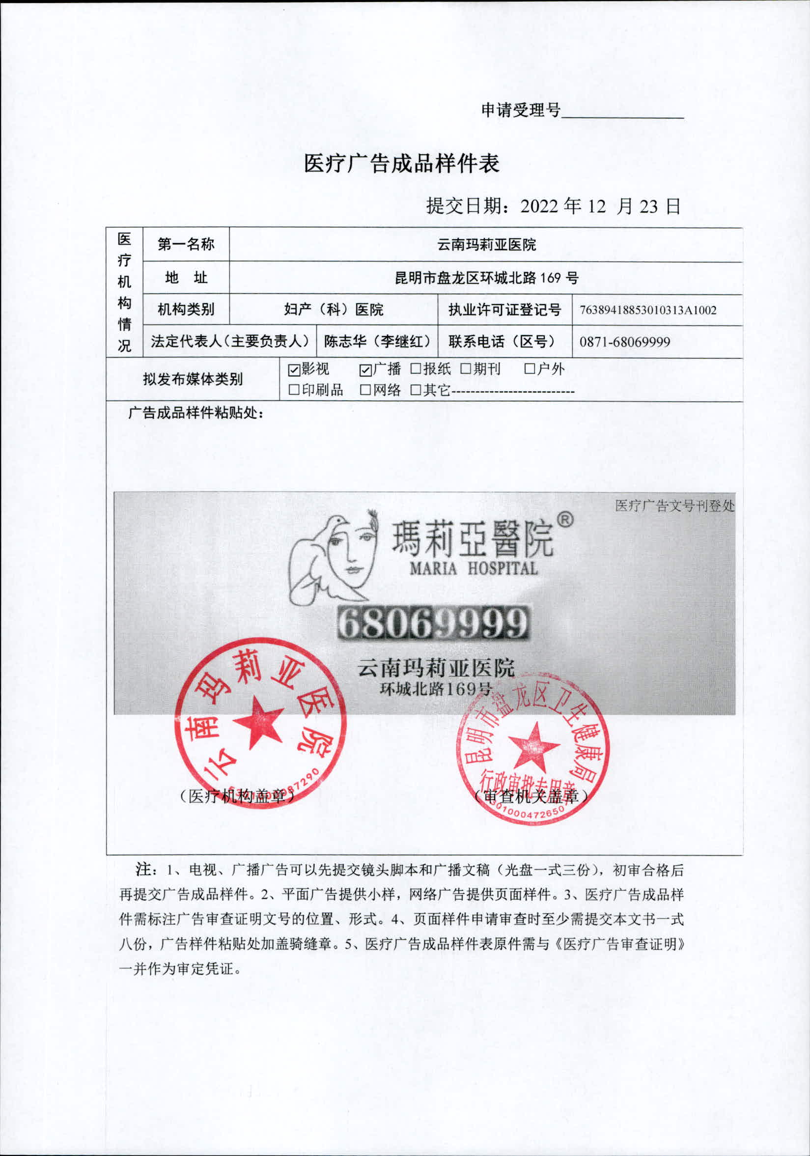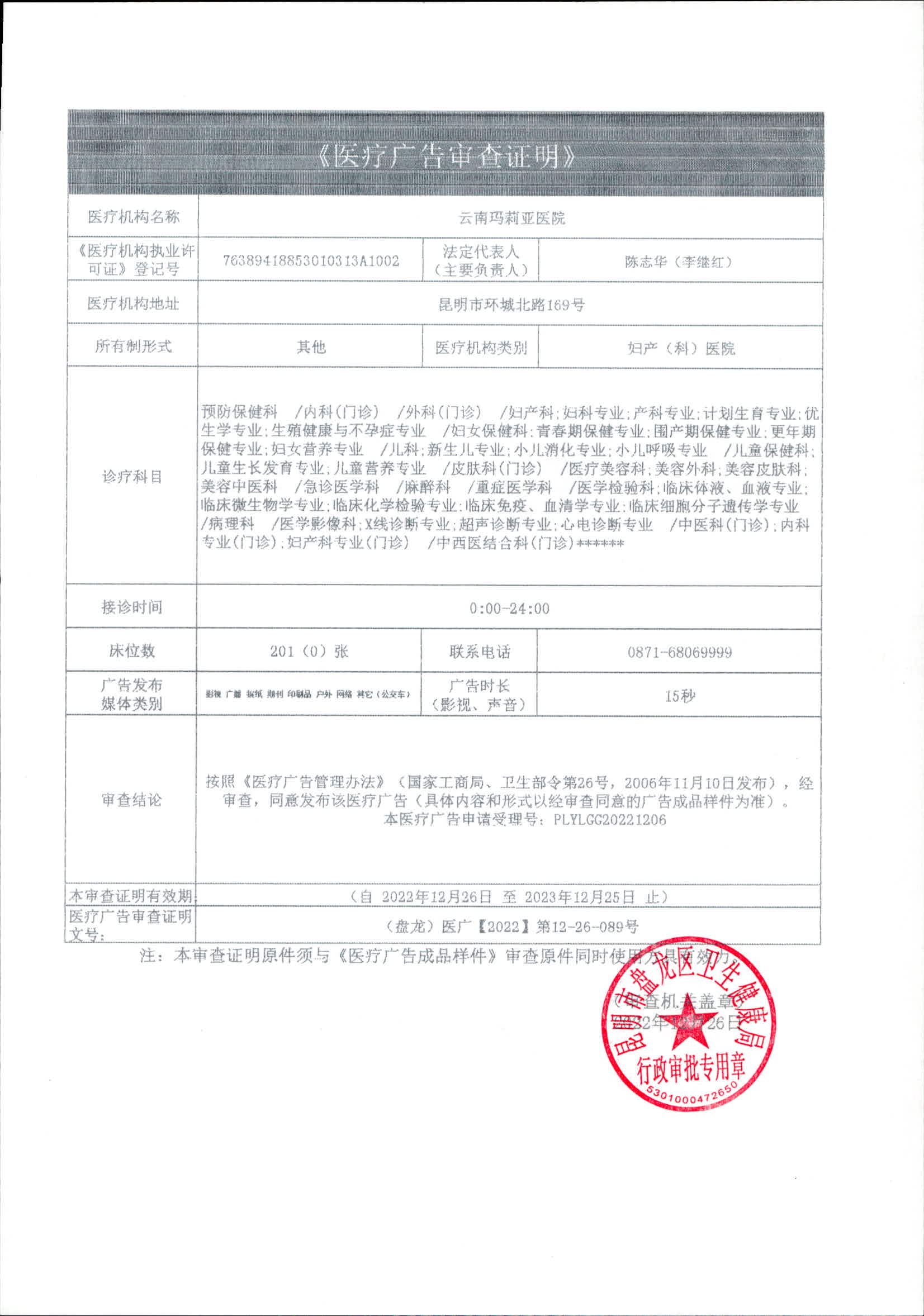 昆明市盘龙区卫生健康局云南玛莉亚医院2022年医疗广告审查证明