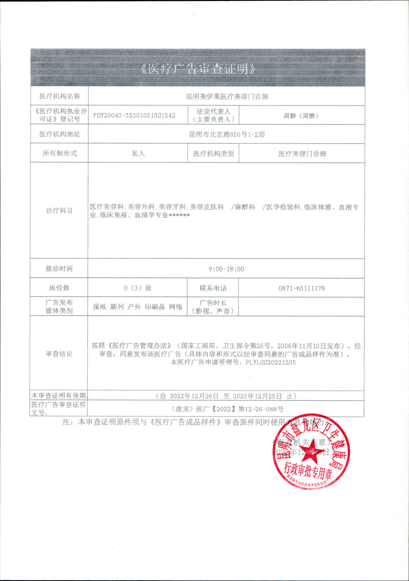 昆明市盘龙区卫生健康局昆明美伊莱医疗美容门诊部2022年医疗广告审查证明