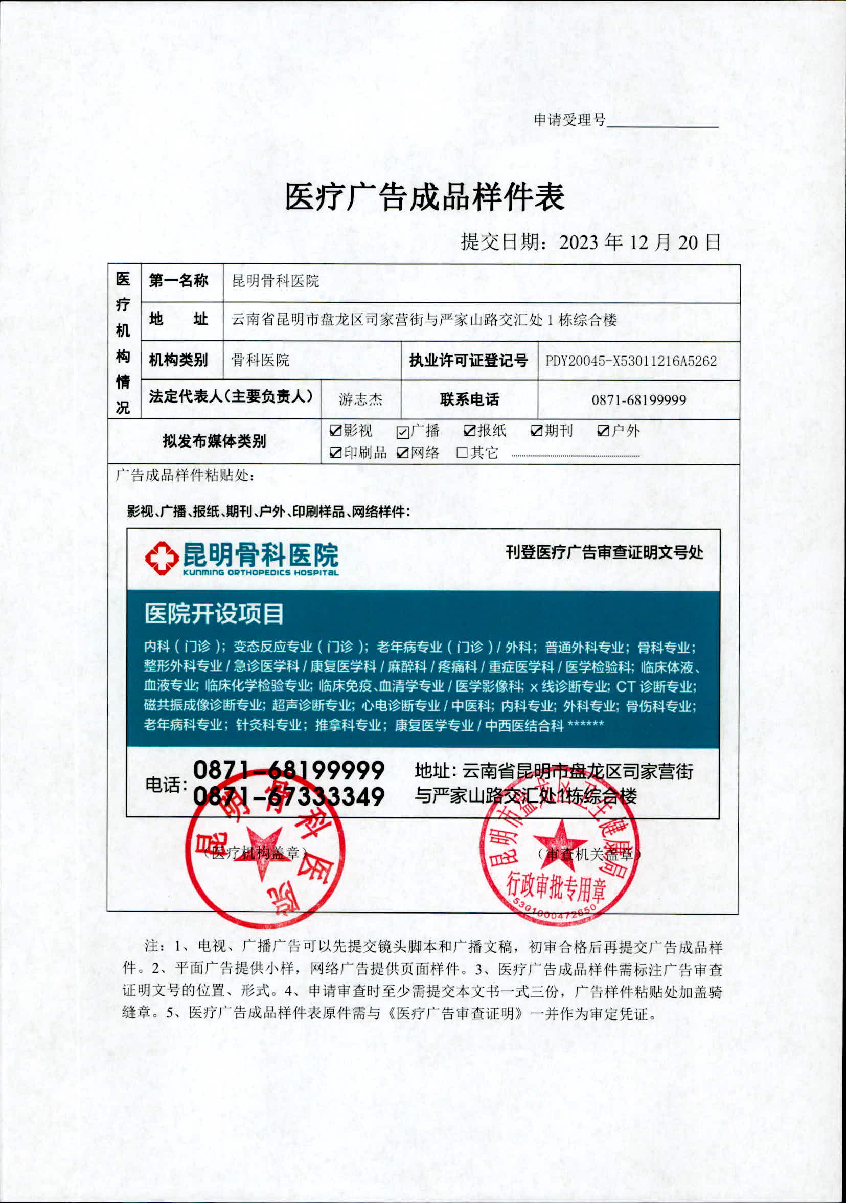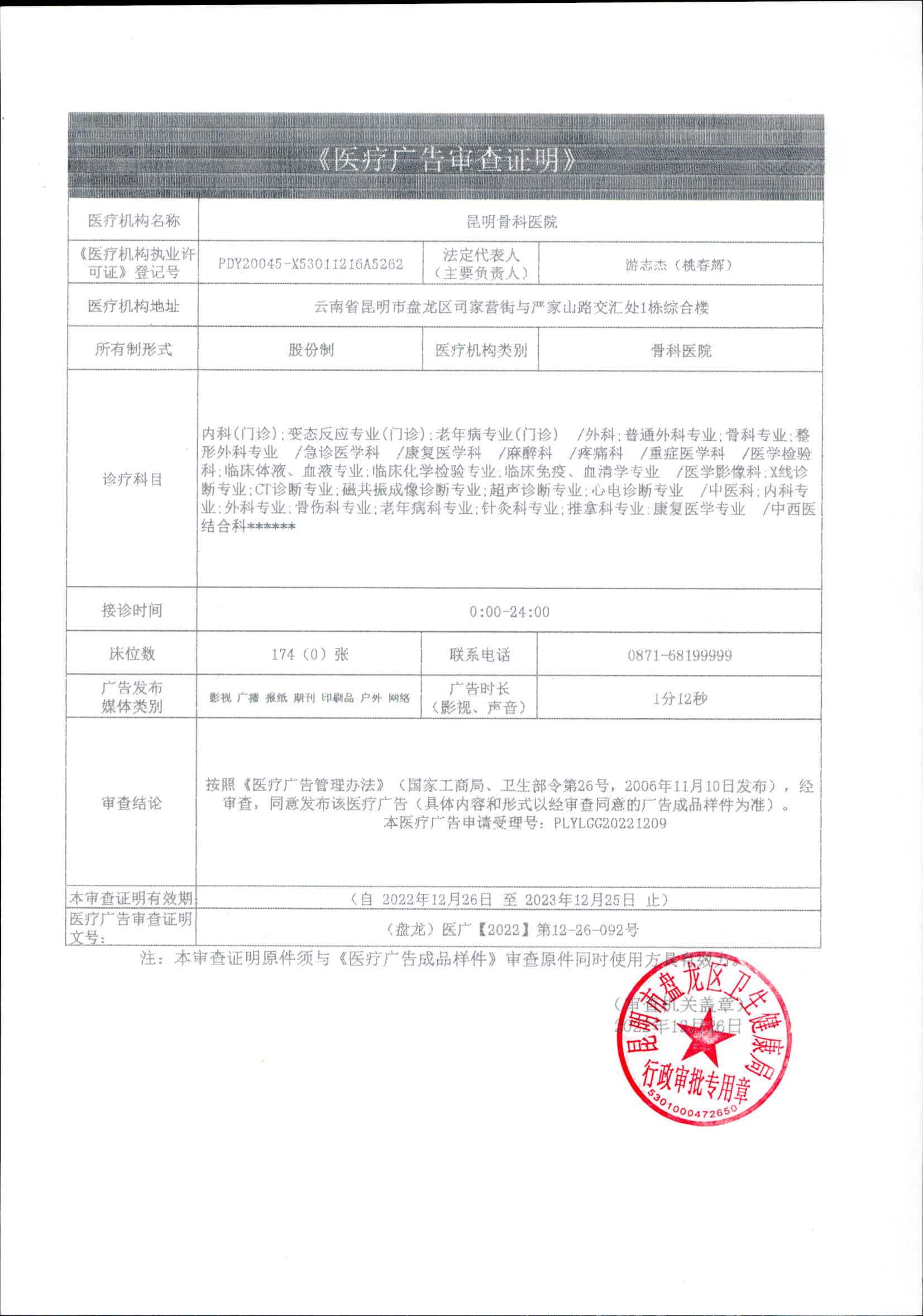 昆明市盘龙区卫生健康局昆明骨科医院医疗广告审查证明