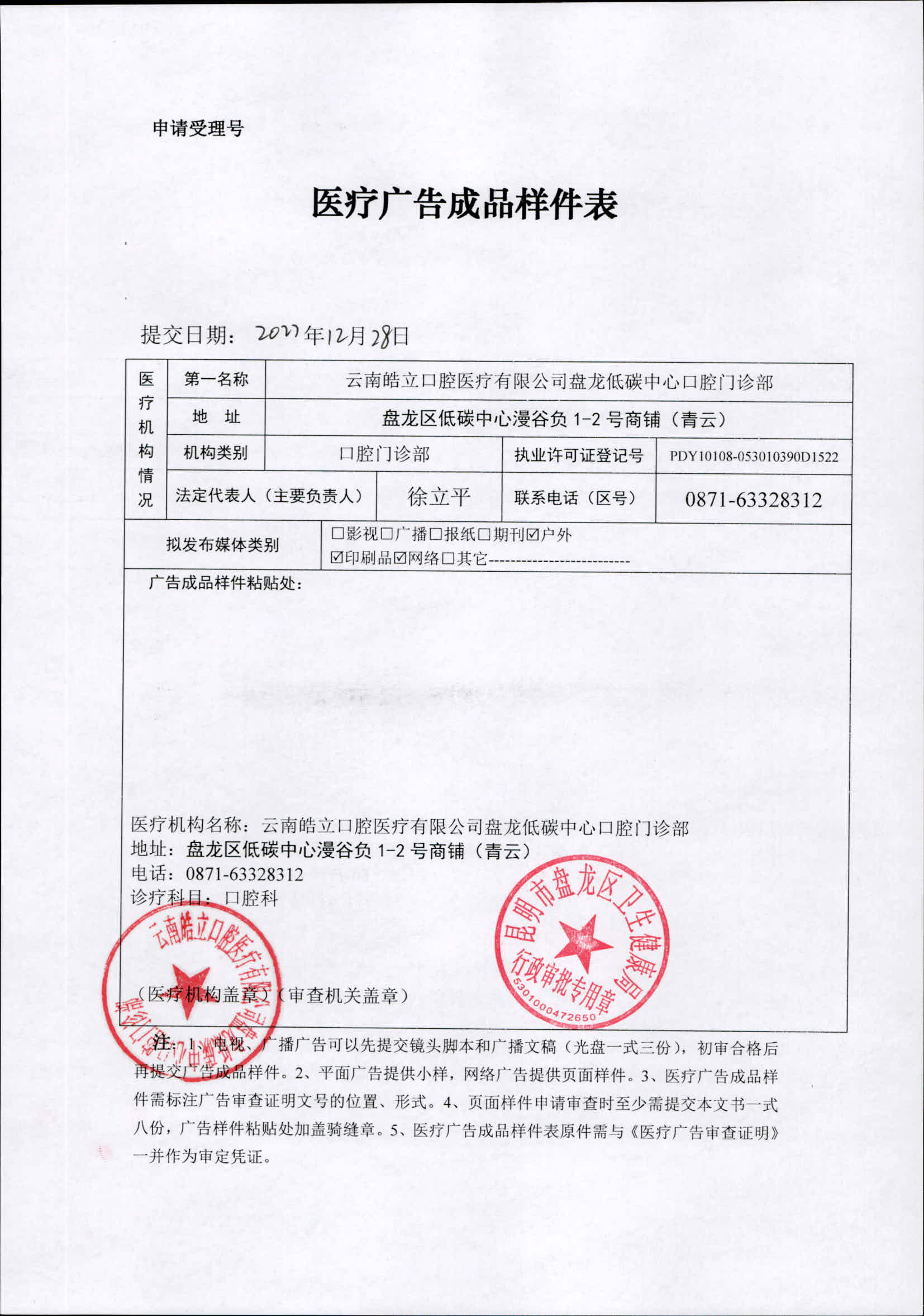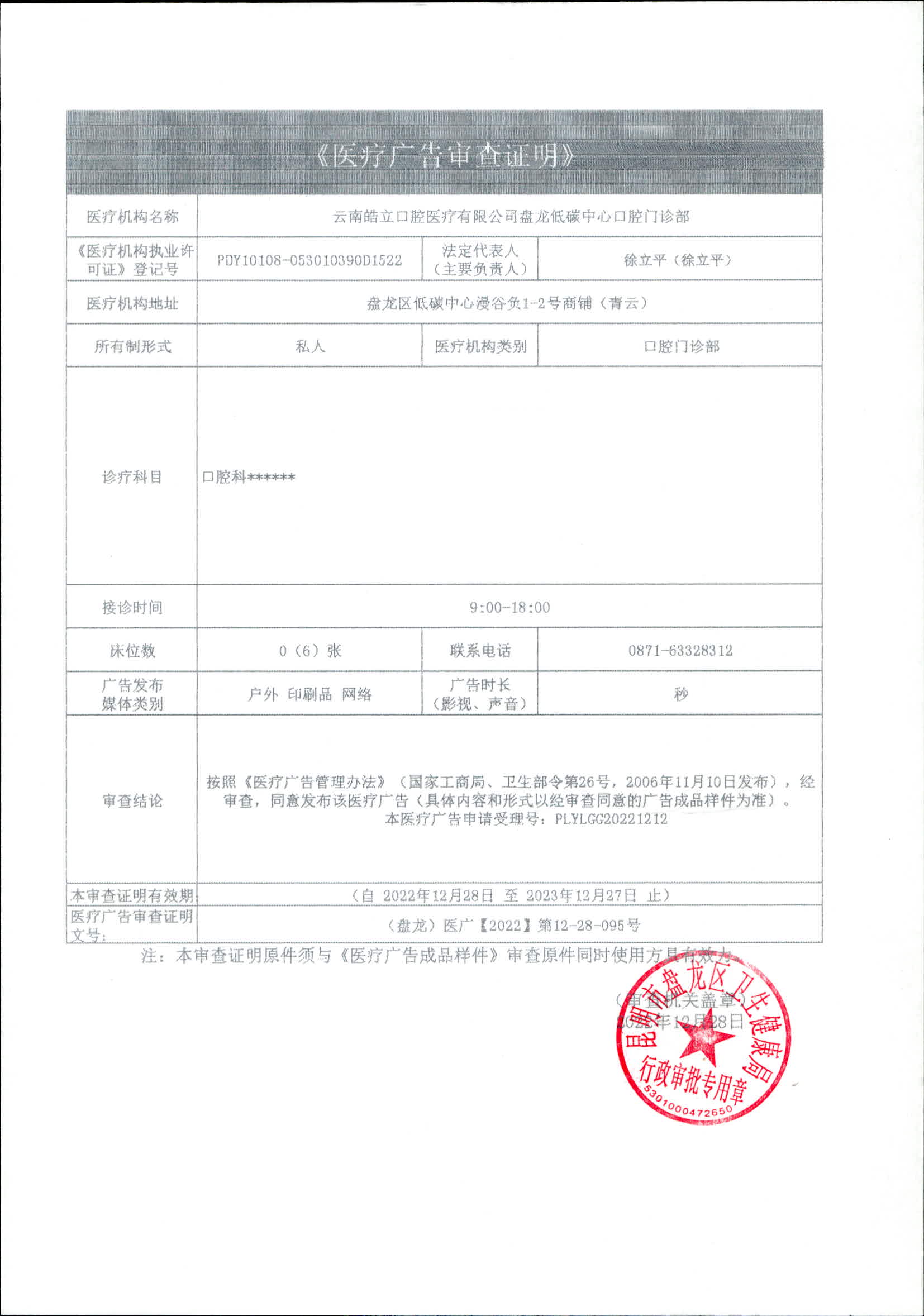 昆明市盘龙区卫生健康局云南皓立口腔医疗有限公司盘龙低碳中心口腔门诊部医疗广告审查证明