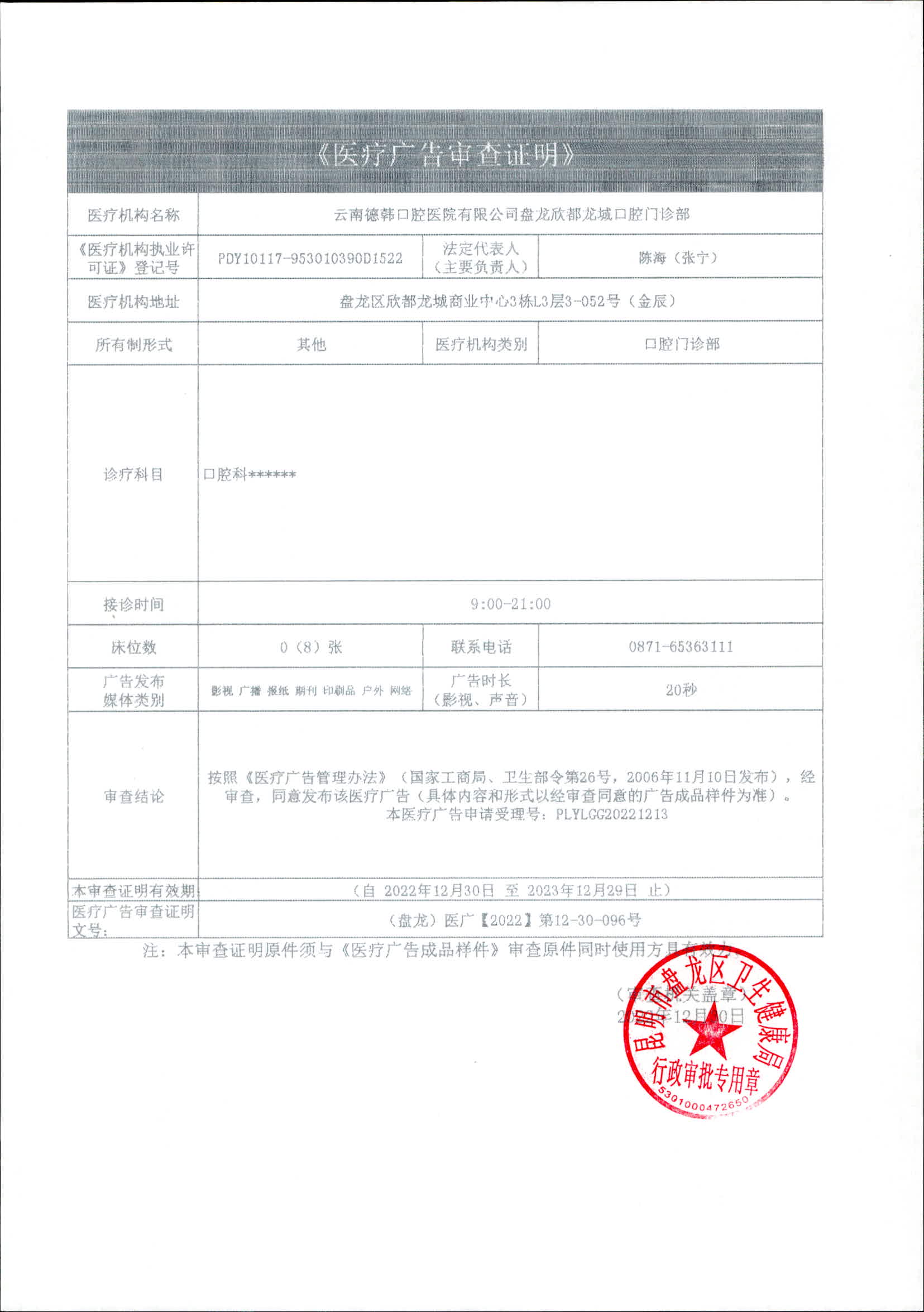 昆明市盘龙区卫生健康局云南德韩口腔医院有限公司盘龙欣都龙城口腔门诊部2022年医疗广告审查证明