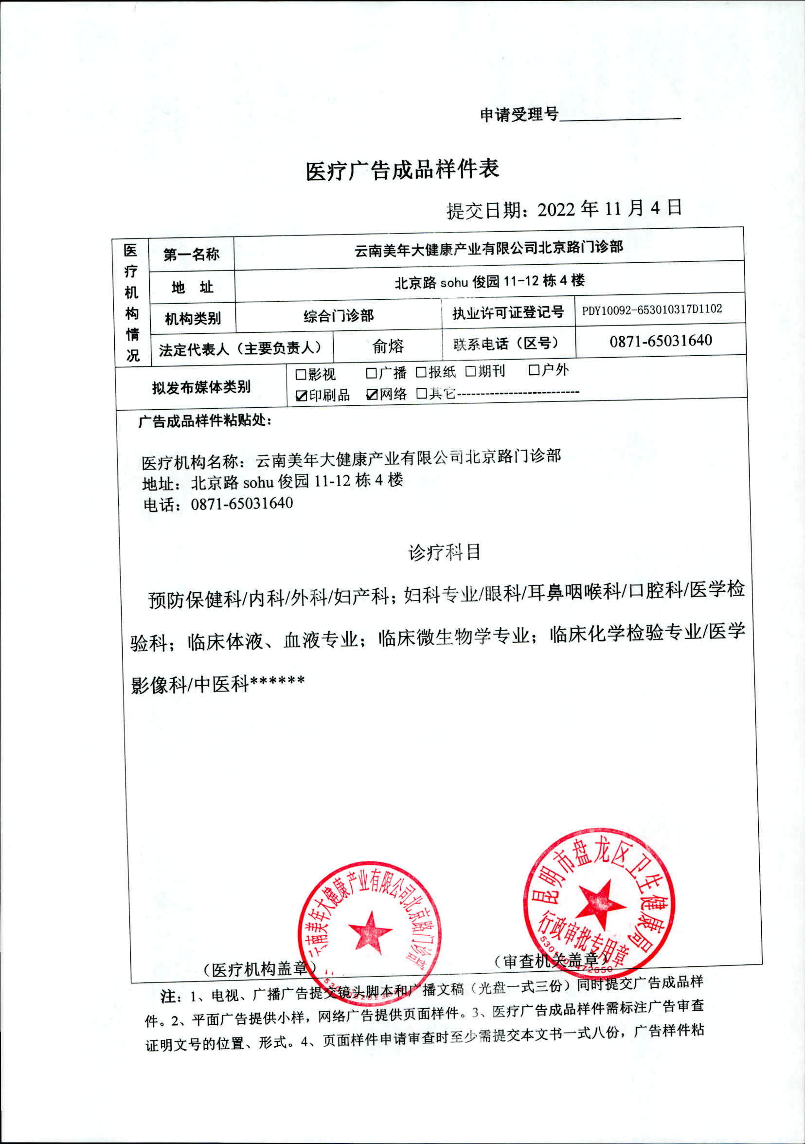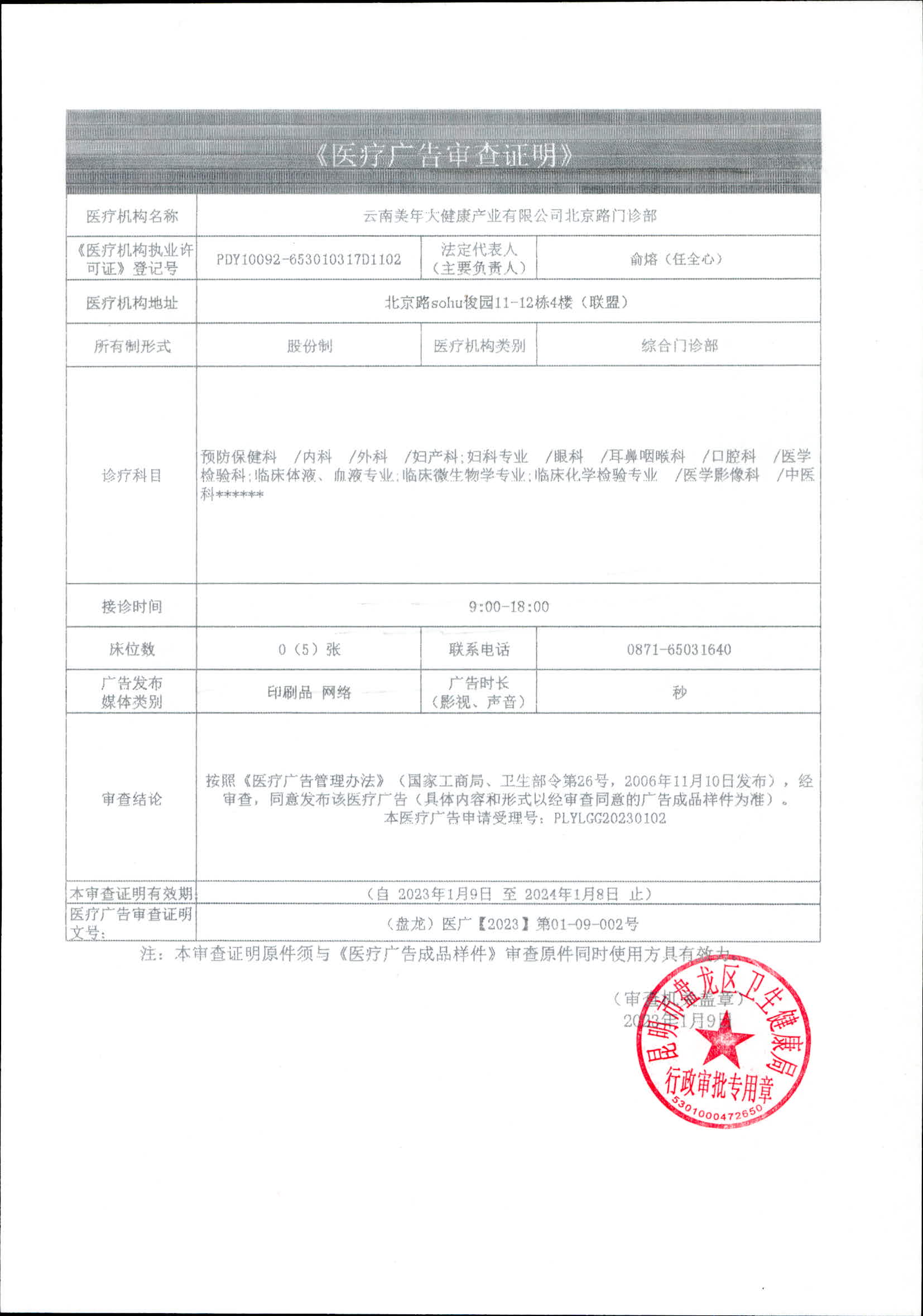 昆明市盘龙区卫生健康局云南美年大健康产业有限公司北京路门诊部 医疗广告审查证明