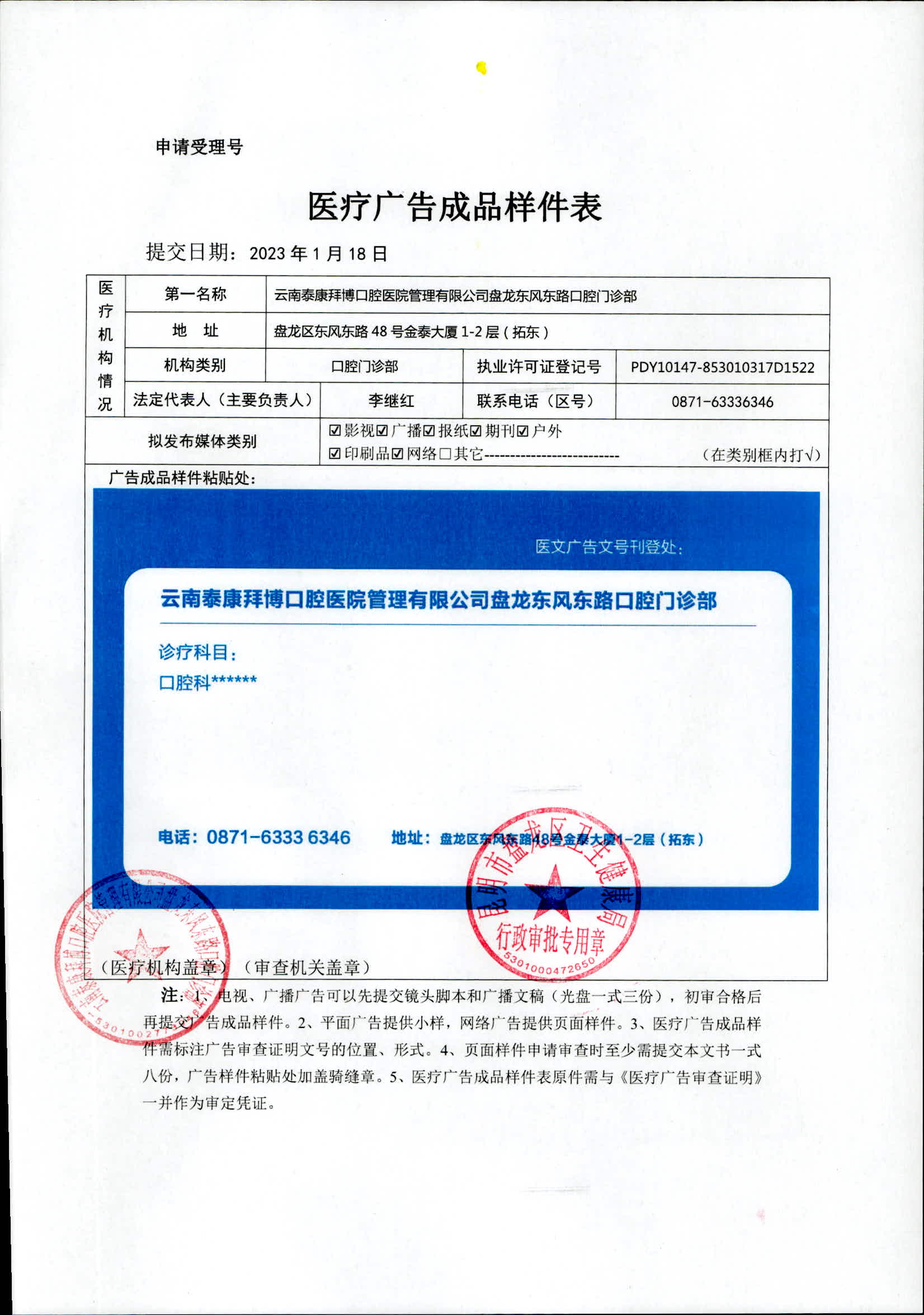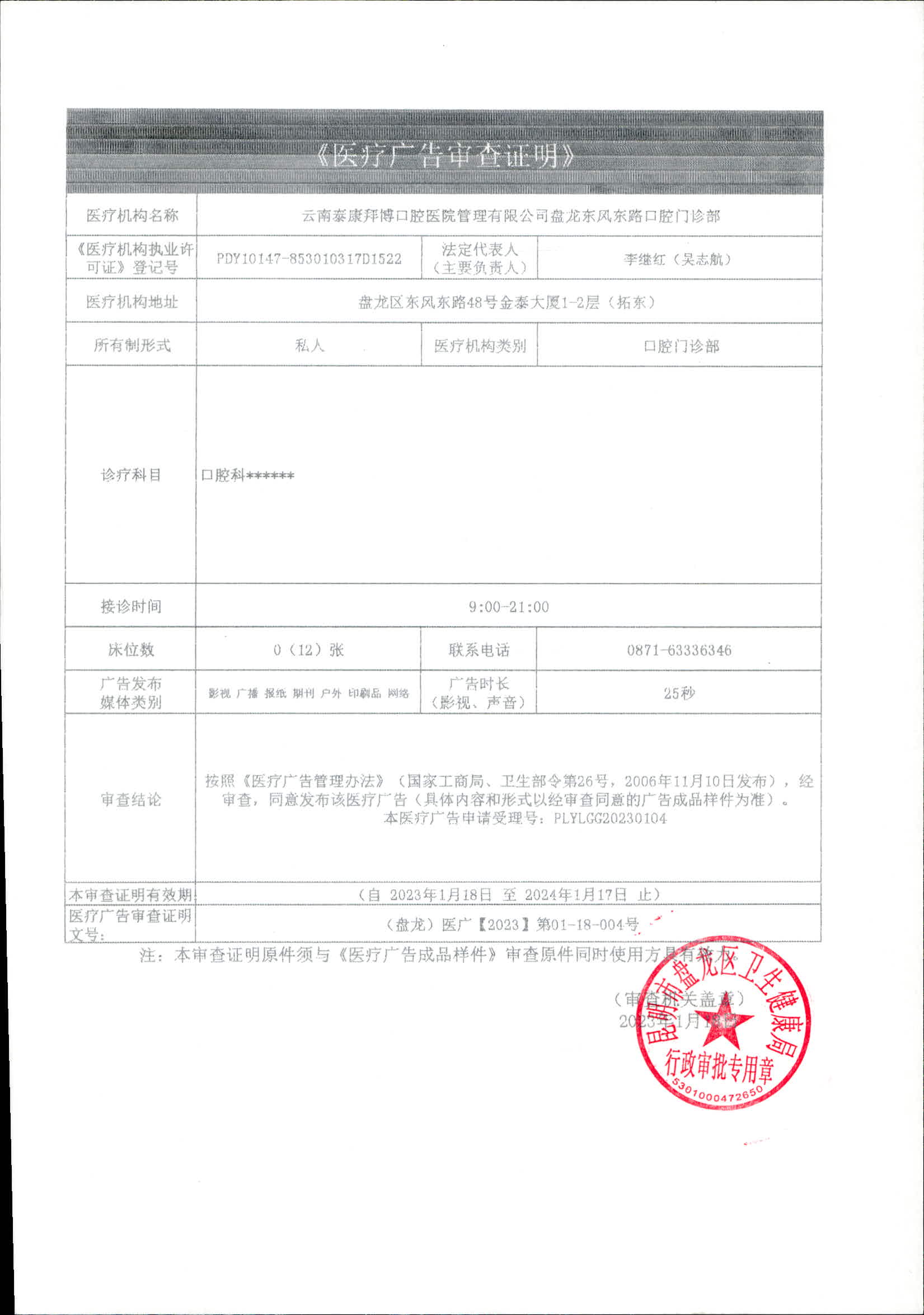 昆明市盘龙区卫生健康局云南泰康拜博口腔医院管理有限公司盘龙东风东路口腔门诊部《医疗广告审查证明》
