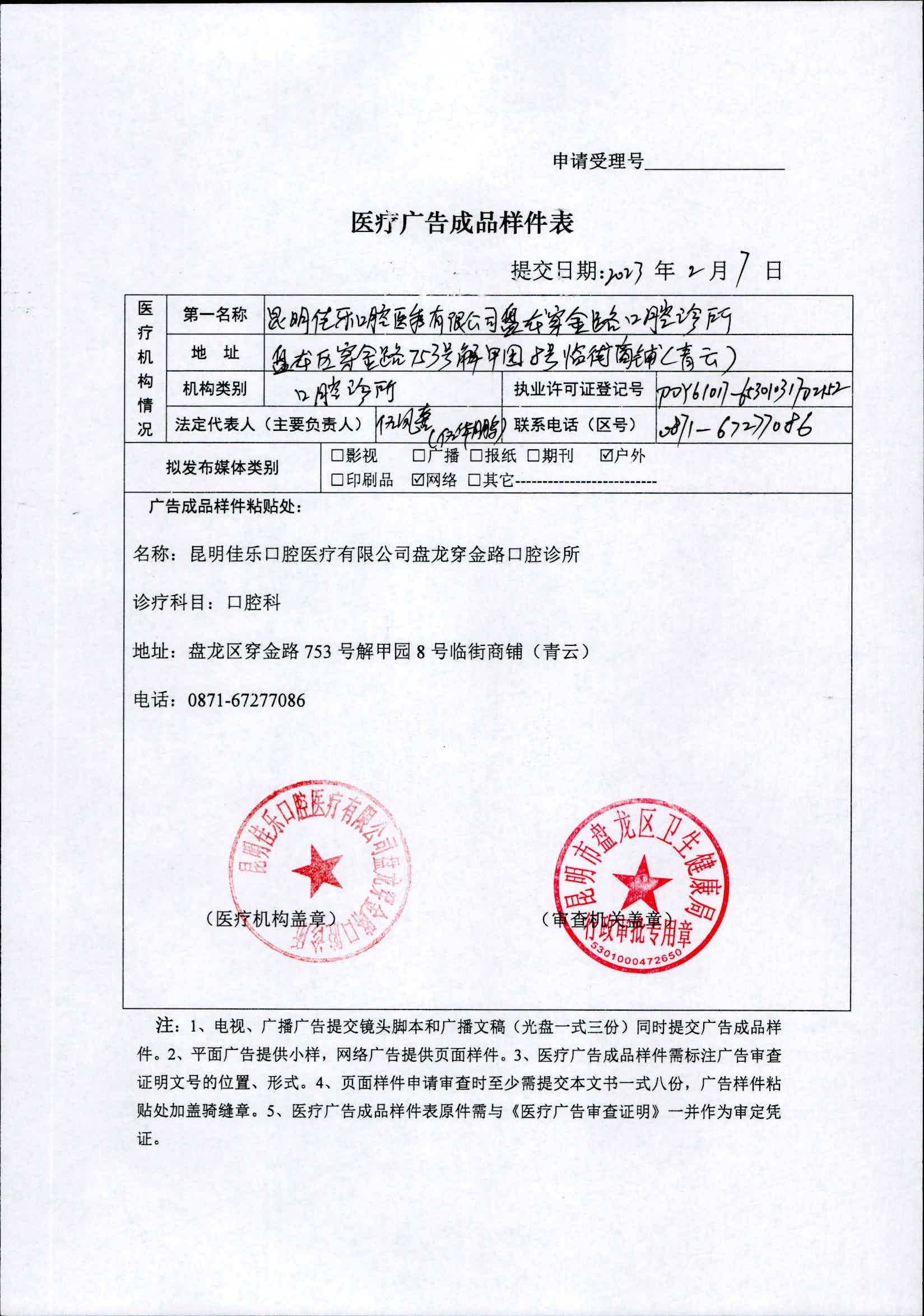 昆明市盘龙区卫生健康局昆明佳乐口腔医疗有限公司盘龙穿金路口腔诊所《医疗广告审查证明》