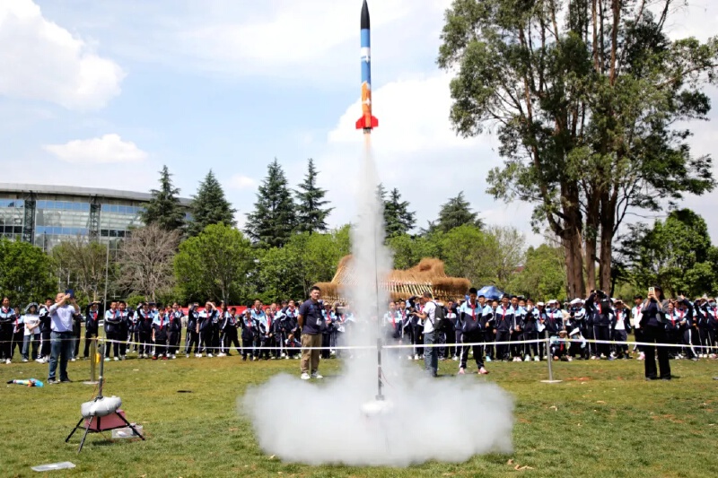 讲座结束后,火箭研制专家杨敬贤为同学们讲解了火箭制造及飞行原理。“5、4、3、2、1,发射!”同学们在专家的带领下,动手制作火箭模型,并在火箭广场成功模拟了火箭发射。活动亲自动手参与,同学们更加深刻地理解了火箭构造原理以及飞行原理。