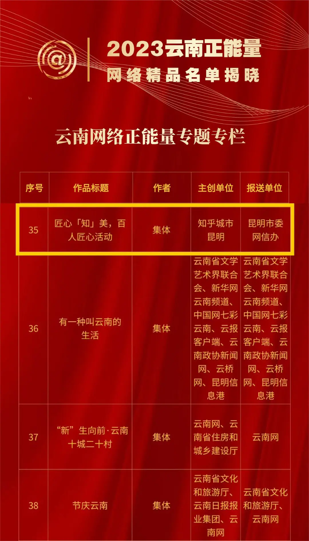 今年,“云南美好生活”2024云南网络正能量建设推进会在昆明召开。会上揭晓了2023云南正能量网络精品征集展播活动评选结果并颁发证书,发布了2023年云南省新闻单位网络账号传播力表现“十佳账号”、云南十佳正能量网络账号、2023年云南十佳网络暖心故事以及“有一种叫云南的生活”网络IP十大关键词、网民十大心动目的地、十大网络传播爆款等。中共盘龙区委统战部携手知乎城市昆明发起的“匠心「知」美,百人匠心活动”在2023云南正能量网络精品征集展播活动中荣获“精品网络正能量专题专栏”荣誉!