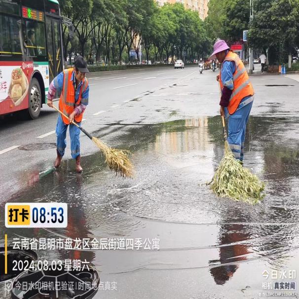 降雨过后,督促云南京环盘宸公司第一时间安排环卫工人与作业车辆相互配合做好雨后保洁,机械车辆对城区主要道路进行降尘冲洗,环卫工人对散落树枝落叶、路面漂浮垃圾等进行巡回清扫,及时清理堵塞雨水箅子的垃圾,提高道路路面清洁度,对低洼路段的积水、淤泥进行重点清除,及时消除、减少路面污水、泥沙积存,确保雨后路面清洁达到路见本色。同时,对沿街垃圾箱、果皮箱等环卫设施进行清洗,确保环卫设施由内而外干净整洁。8月3日至8月8日,淹积水处置共计出动人员1034人、垃圾收集车辆343余车次、清理卫生死角74余处、清理清掏雨水箅子893余处,清理垃圾154余吨。