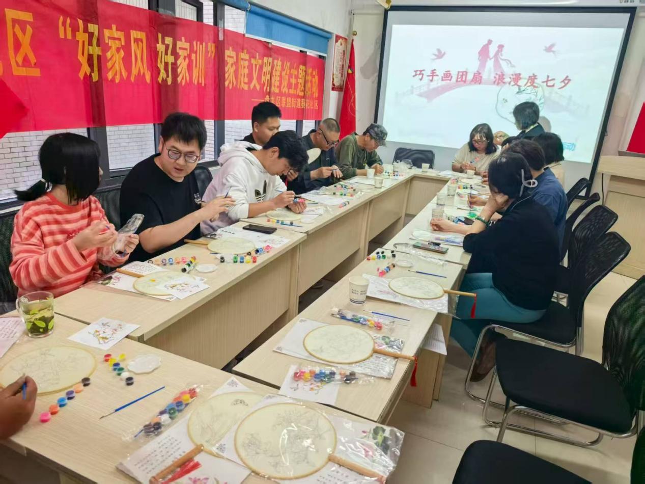 进入创作环节,大家手持空白团扇,发挥想象自主创作:大家用明亮色彩勾勒团扇,中老年居民则偏爱淡雅的荷花、祥云图案。老师巡回指导,及时解决颜料晕染、线条把控等问题。经过1小时的创作,一幅幅风格各异的团扇作品新鲜出炉,居民们互相展示、拍照留念,脸上满是成就感。
