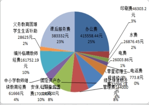 2.办公费、印刷费、水电费、办公设备购置等公用经费681345.12元,包含(1)学校正常运转办公费295099.13元;(2)学校学生考试试卷费及办公资料印刷费53725.48元;(3)学校自来水费20549.45元;(4)学校电费17658.76元;(5)学校电话费1516.3元;(6)维修维护费4020元;(7)上缴工会经费52976元;(8)在职和退休教师七节一生日235800元;(9)教师公用53550元。
