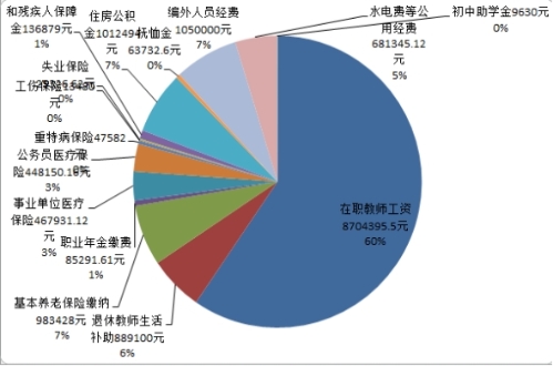 1.基本工资、津贴补贴等人员经费支出13937388.61元,包含(1)在职教师工资8704395.5元;(2)退休教师生活补助889100元;3.基本养老保险缴纳983428元;(4)职业年金缴费85291.61元;(5)事业单位医疗保险467931.12元;(6)公务员医疗保险448150.16元;(7)工伤保险13480元;(8)失业保险25326.62元;(9)重特病保险47582元;(10)和残疾人保障金136879元;(11)初中助学金9630元;(12)住房公积金1012494元;(13)抚恤金63732.6元;(14)编外人员经费1050000元。