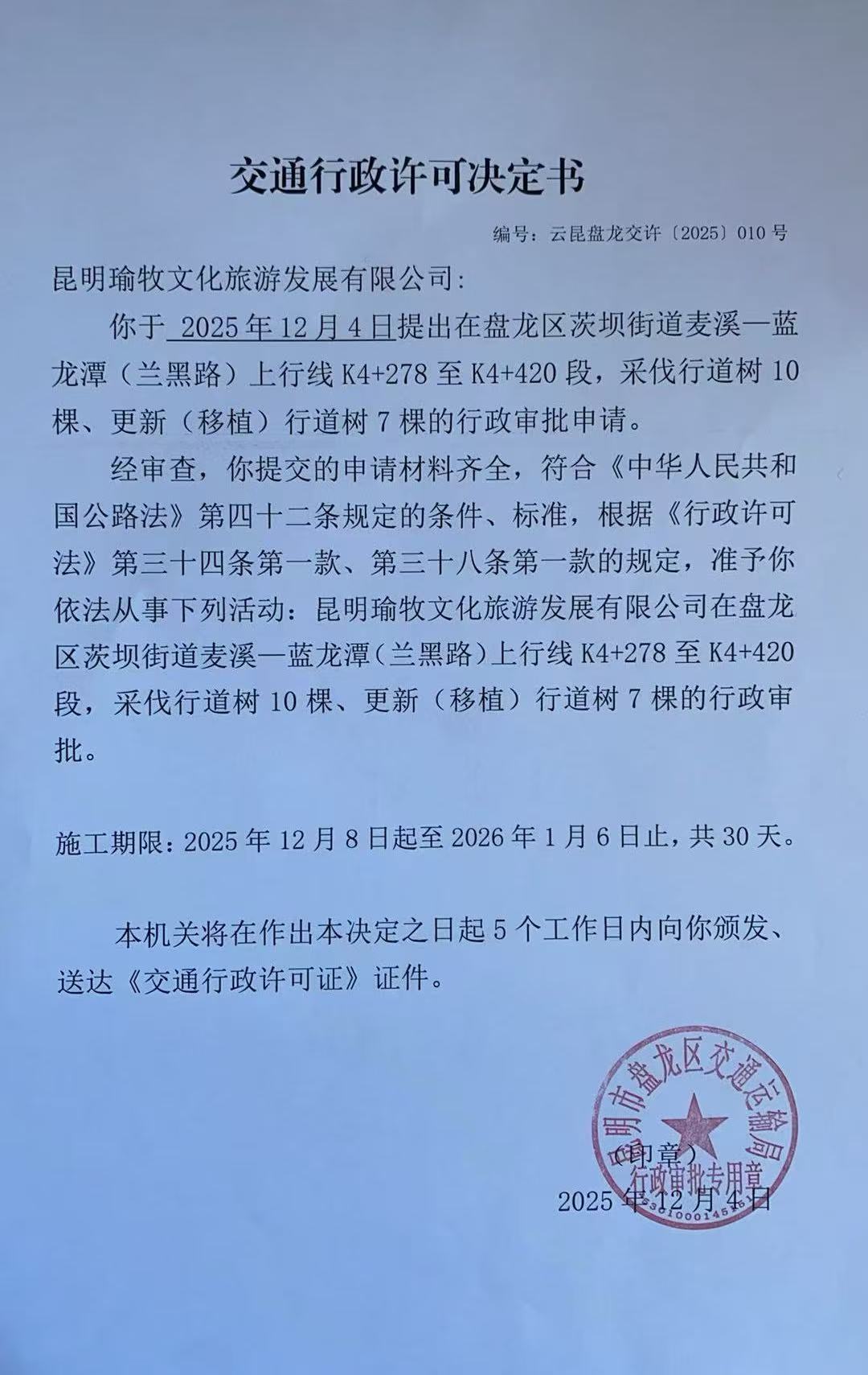 交通行政许可决定书:云昆盘龙交许〔2025〕010号