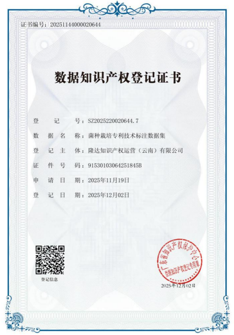 近日,由昆明数字经济产业知识产权服务中心全程协助的《菌种栽培专利技术标注数据集》成功获得数据知识产权登记证书(登记号:SZ2025220020644.7)。这是盘龙区市场监管局自2025年4月推动全省首个数字经济产业知识产权服务中心挂牌成立以来,短短数月在数据要素服务领域取得的首个标志性成果,是数据要素市场化配置改革在云南迈出的实质性一步,为全省数据资产化运营提供了可复制、可推广的“盘龙样本”。