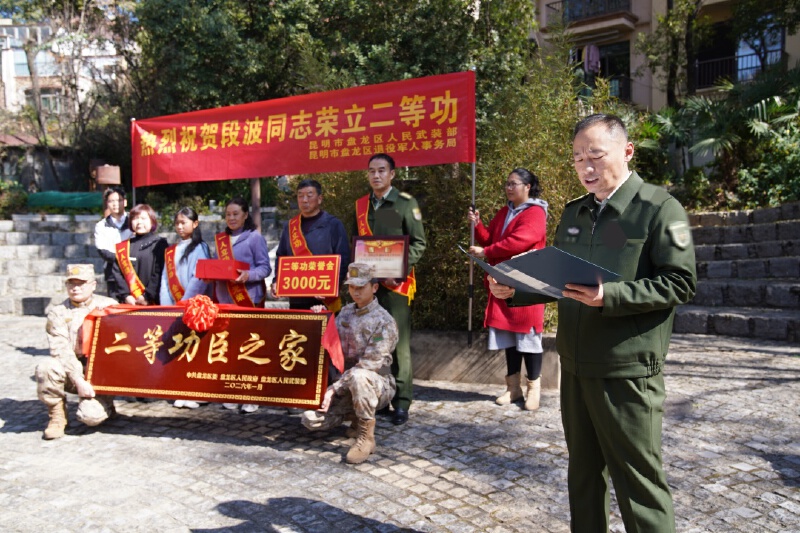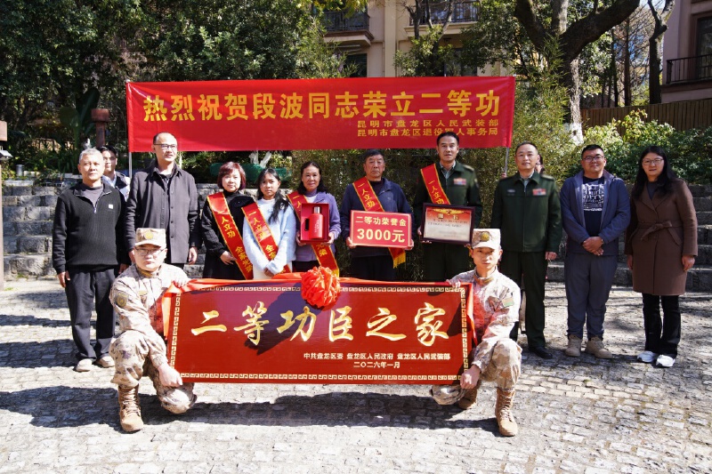 为弘扬新时代拥军优属光荣传统,增强军人荣誉感和军属自豪感,营造“一人当兵 全家光荣”的良好社会氛围,1月27日下午,盘龙区人民武装部联合区退役军人事务局、区退役军人服务中心、金辰街道、联盟街道等单位,一同为荣立二等功的段波和荣获二级表彰的李佩於家庭送去立功喜报。