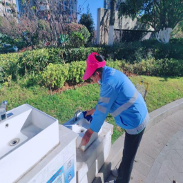 三是做好洗手设施的保洁工作。在日常保洁工作中,实行“随脏随保+定时消杀”的保洁模式,做好辖区内洗手台的保洁工作。一方面,及时清擦水龙头、台面、镜面的水剂、雾气及污物,采用“清水冲洗—专业清洁剂擦拭—干净抹布擦干”的流程,彻底清除顽固污渍,确保设施表面无死角、无残留;另一方面,同步做好洗手台周边环境整治,及时清理垃圾、疏导污水,保持周边区域整洁有序。