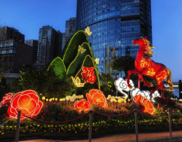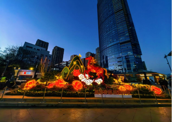 移步至恒隆广场前的 “骏启新春” 景观,则另有一番气韵。这匹以钢架焊接、烤漆雪弗板打造的奔腾骏马,高达4.5米,在繁华的北京路与崇礼街口尽显奋进之姿。设计独具匠心,采用双向发光结构,无论白昼黑夜,皆能展现其动人风采。两侧发光春联,“花满春城”、“昆明有你”的字样彰显新春氛围,与四周高楼玻璃幕墙的倒影共同织就了一幅流动的城市光影诗。