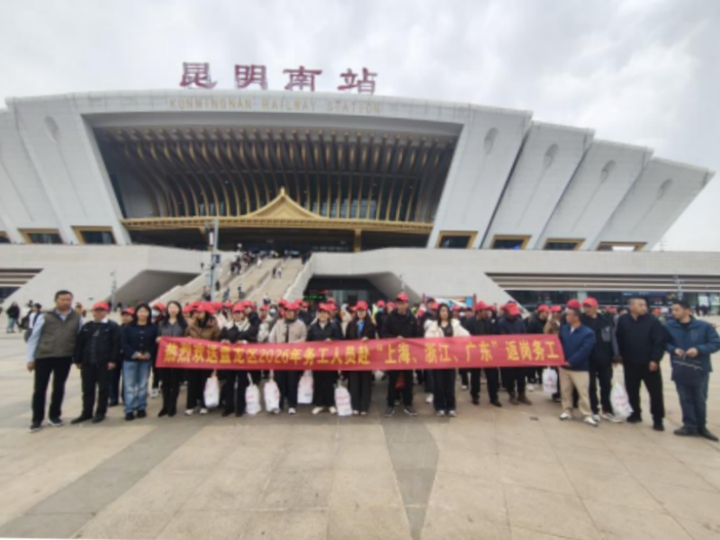 2月25日上午,从滇源街道开出的大巴包车搭载着48名返岗务工人员到达昆明南火车站。广场上暖意氤氲,整齐列队的返岗务工人员整装待发,“热烈欢送盘龙区2026年务工人员赴上海、浙江、广东返岗务工”的标语格外醒目。